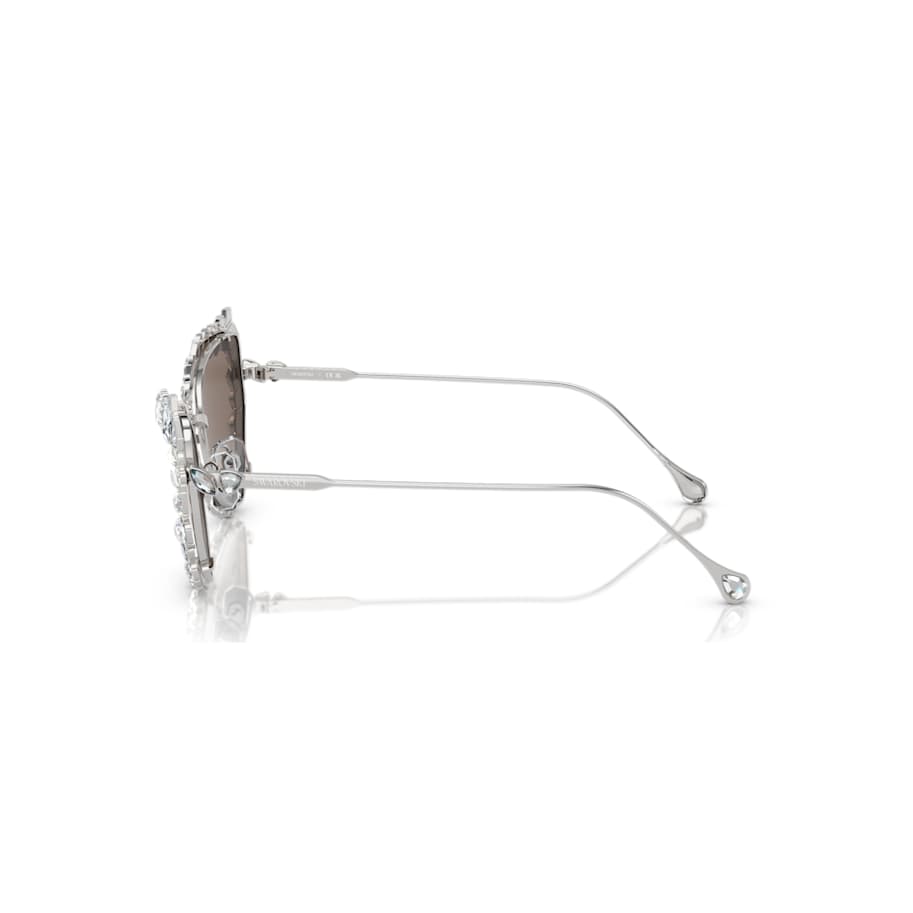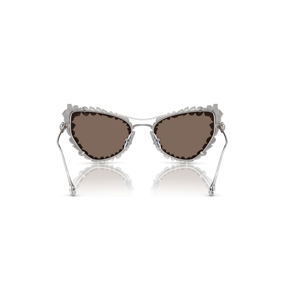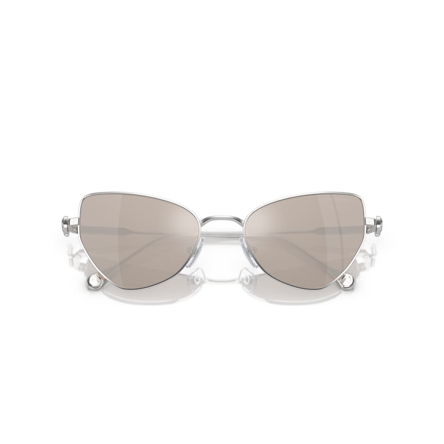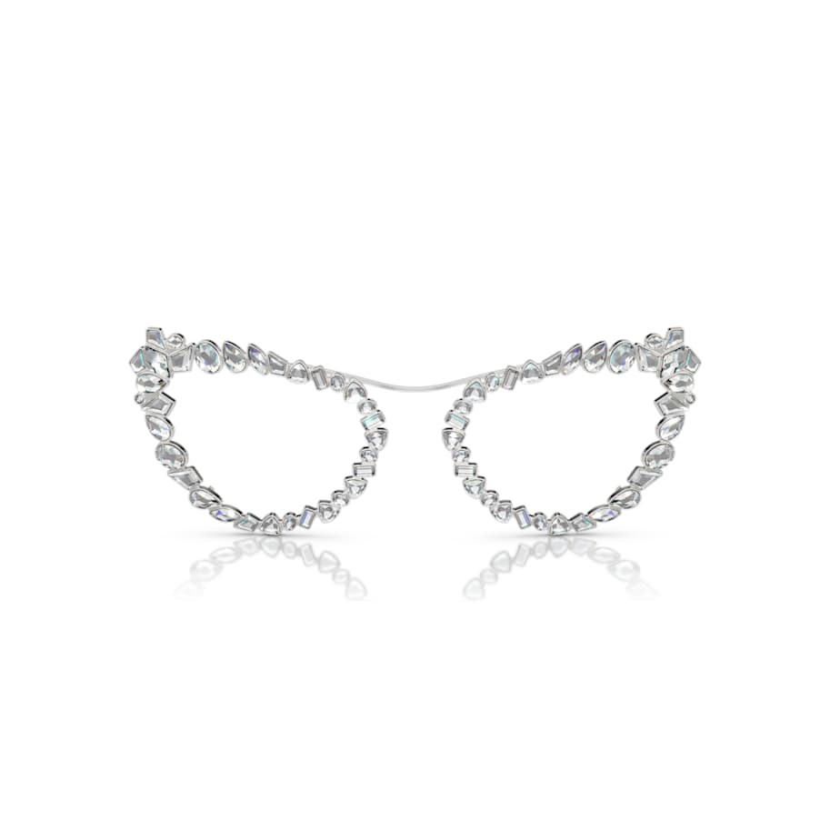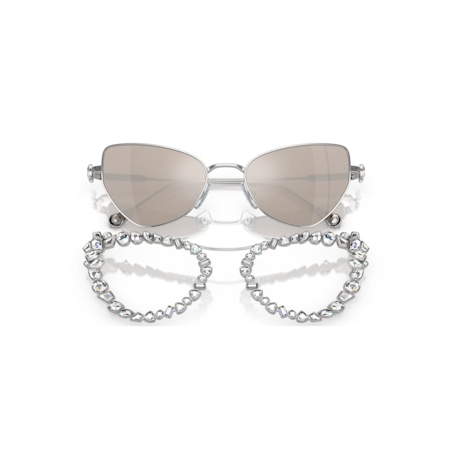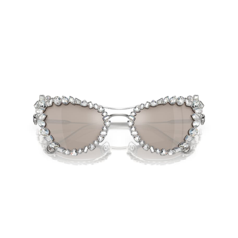 These versatile sunglasses can be worn in multiple ways, giving you the choice of extravagant or subtle style. Inspired by our Mesmera jewelry range, the design features gunmetal frames with mirror platinum lenses and crystals on the temples and tips. The look can also be enhanced with a crystallized clip-on frame, which surrounds the lenses in a bold mix of stone cuts. A pair of sunglasses that can change your look in an instant.