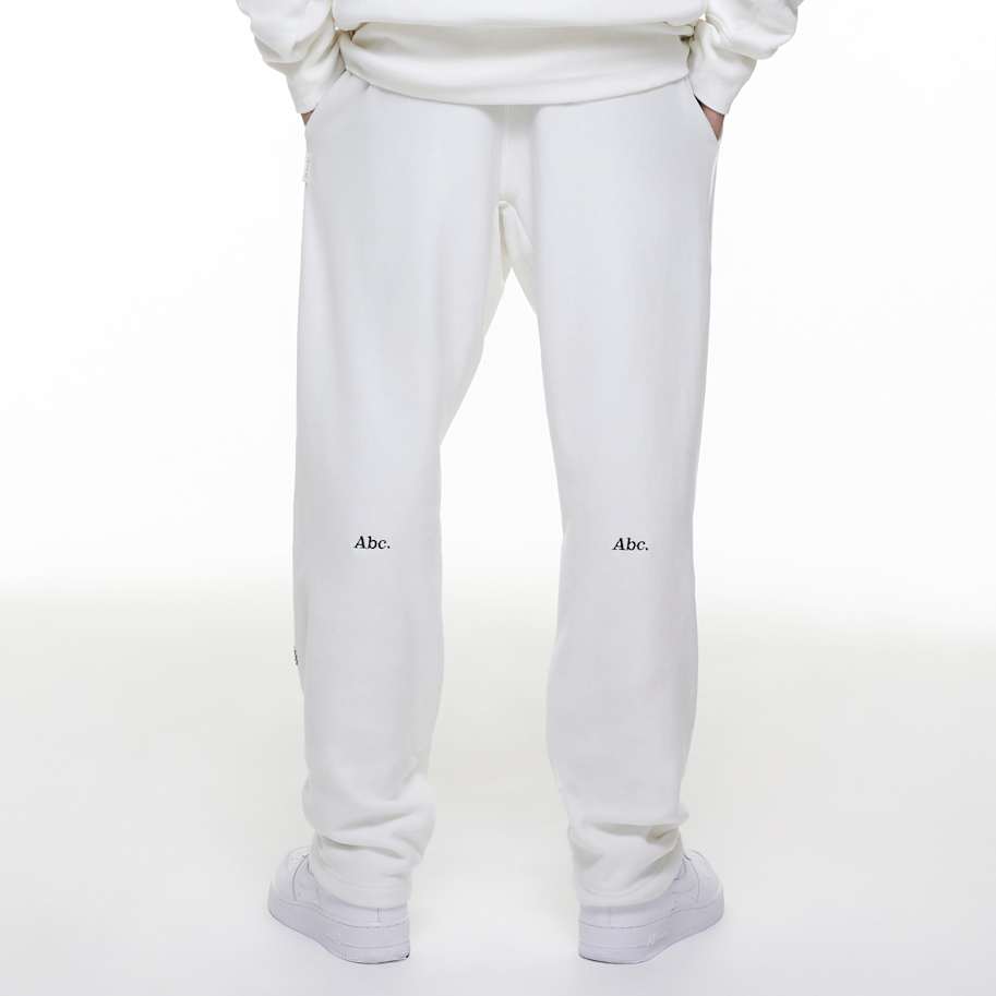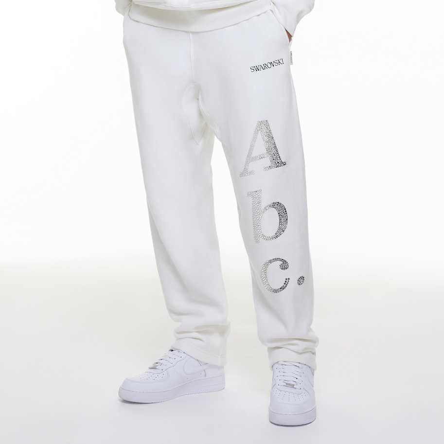Abc. launches their melange sweats in collaboration with Swarovski. Set on a soft swan white base color, the Gray Objects Displaced by Refraction Sweatpants feature the Abc. logo along the left leg in luxe black ombre crystals. Founded in 2015, cult label Abc. brings a comfortable cool to the Swarovski Creators Lab. The model is wearing a size large to achieve a relaxed fit.