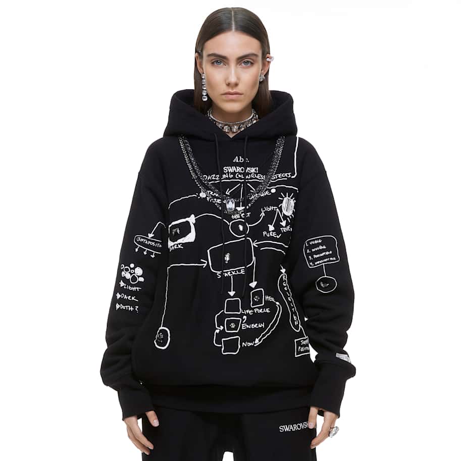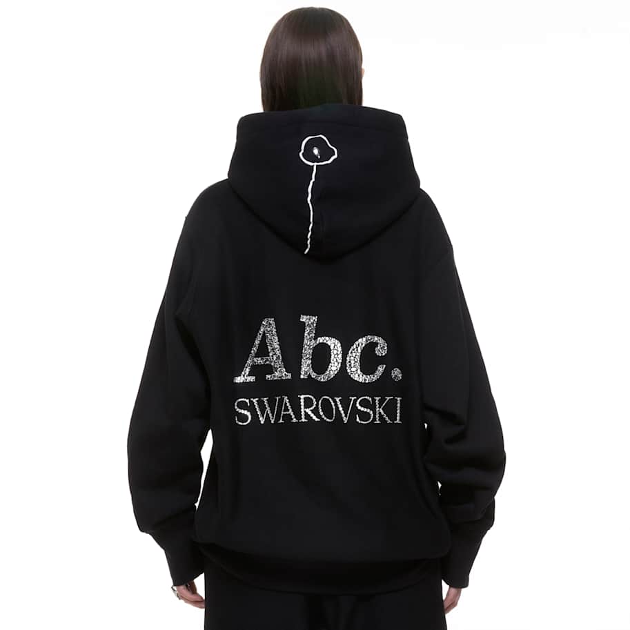 Abc. launches their melange pullover in collaboration with Swarovski. The Dazzling Colorless Objects Sweatshirt features an abstract flow chart on the front decorated with large sew-on crystals in shades from silver to jet black, exploring the contrast between light and dark and the prismatic effect of crystals. On the back are the Abc. and Swarovski logos in crystal transfers featuring 21 inimitable crystal shapes and sizes to make an unmatched trailblazing statement. Founded in 2015, cult label Abc. brings a comfortable cool to the Swarovski Creators Lab. The model is wearing a size large to achieve a relaxed fit.