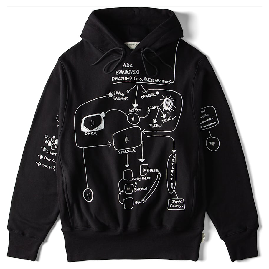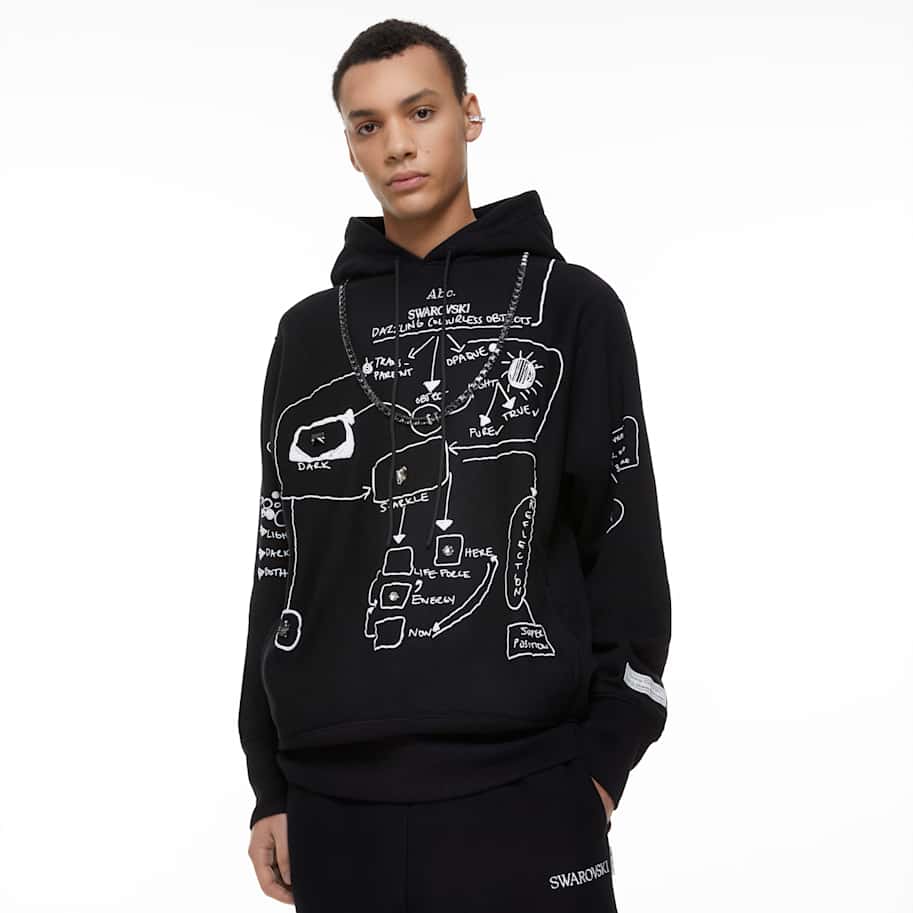 Abc. launches their melange pullover in collaboration with Swarovski. The Dazzling Colorless Objects Sweatshirt features an abstract flow chart on the front decorated with large sew-on crystals in shades from silver to jet black, exploring the contrast between light and dark and the prismatic effect of crystals. On the back are the Abc. and Swarovski logos in crystal transfers featuring 21 inimitable crystal shapes and sizes to make an unmatched trailblazing statement. Founded in 2015, cult label Abc. brings a comfortable cool to the Swarovski Creators Lab. The model is wearing a size large to achieve a relaxed fit.