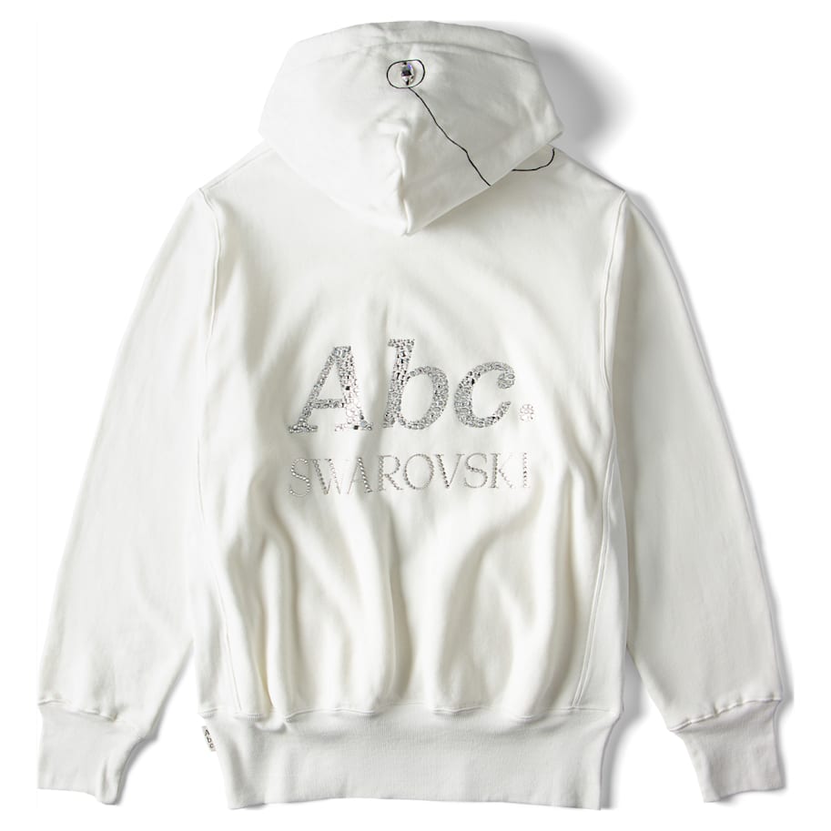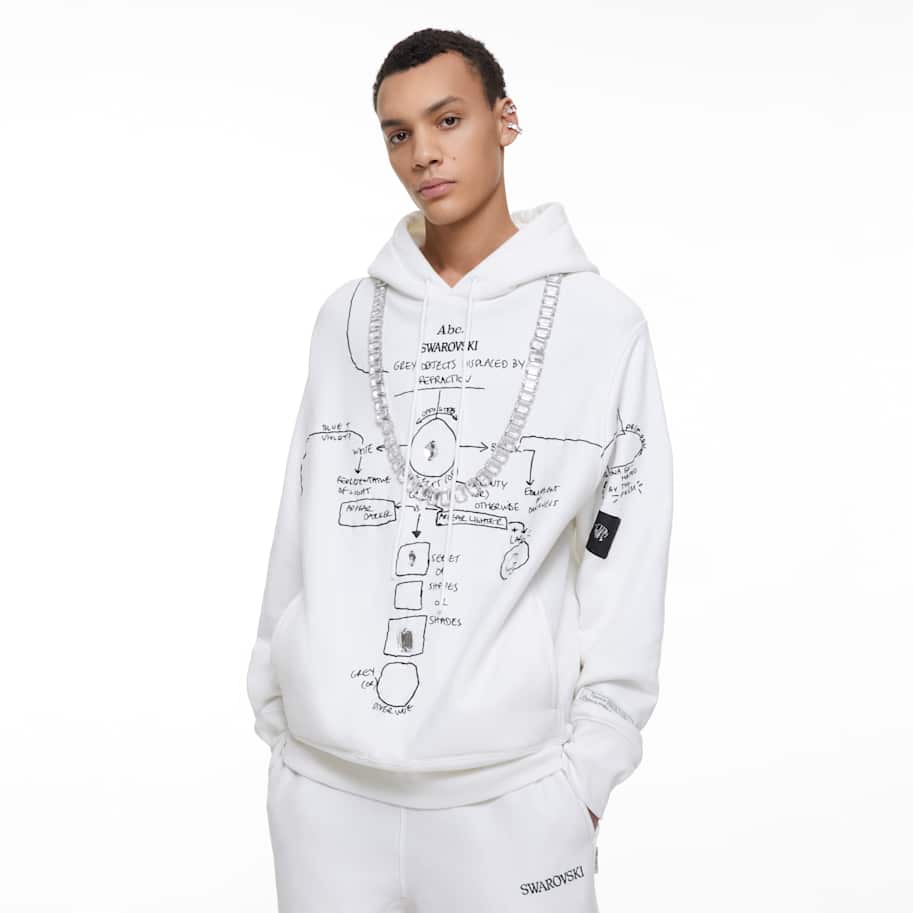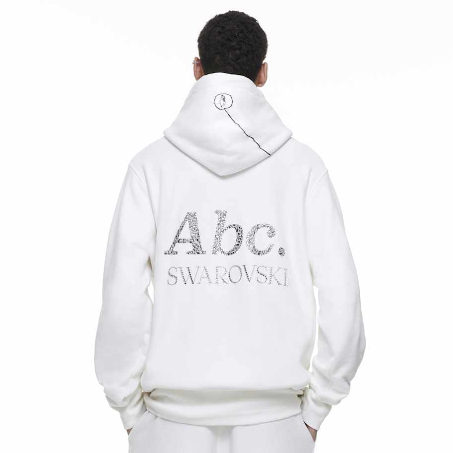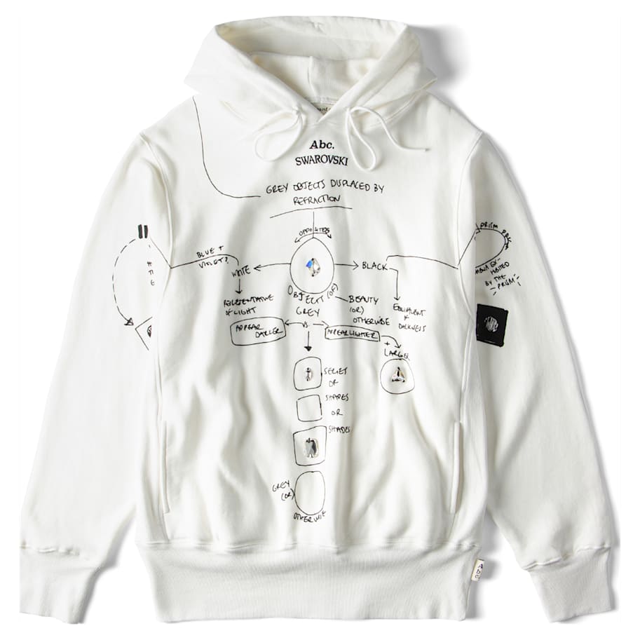 Abc. launches their melange pullover in collaboration with Swarovski. The Gray Objects Displaced by Refraction Sweatshirt features an abstract flow chart on the front decorated with large sew-on crystals in clear color, exploring the contrast between light and dark and the prismatic effect of crystals. On the back are the Abc. and Swarovski logos in crystal transfers featuring 21 inimitable crystal shapes and sizes to make an unmatched trailblazing statement. Founded in 2015, cult label Abc. brings a comfortable cool to the Swarovski Creators Lab. The model is wearing a size large to achieve a relaxed fit.