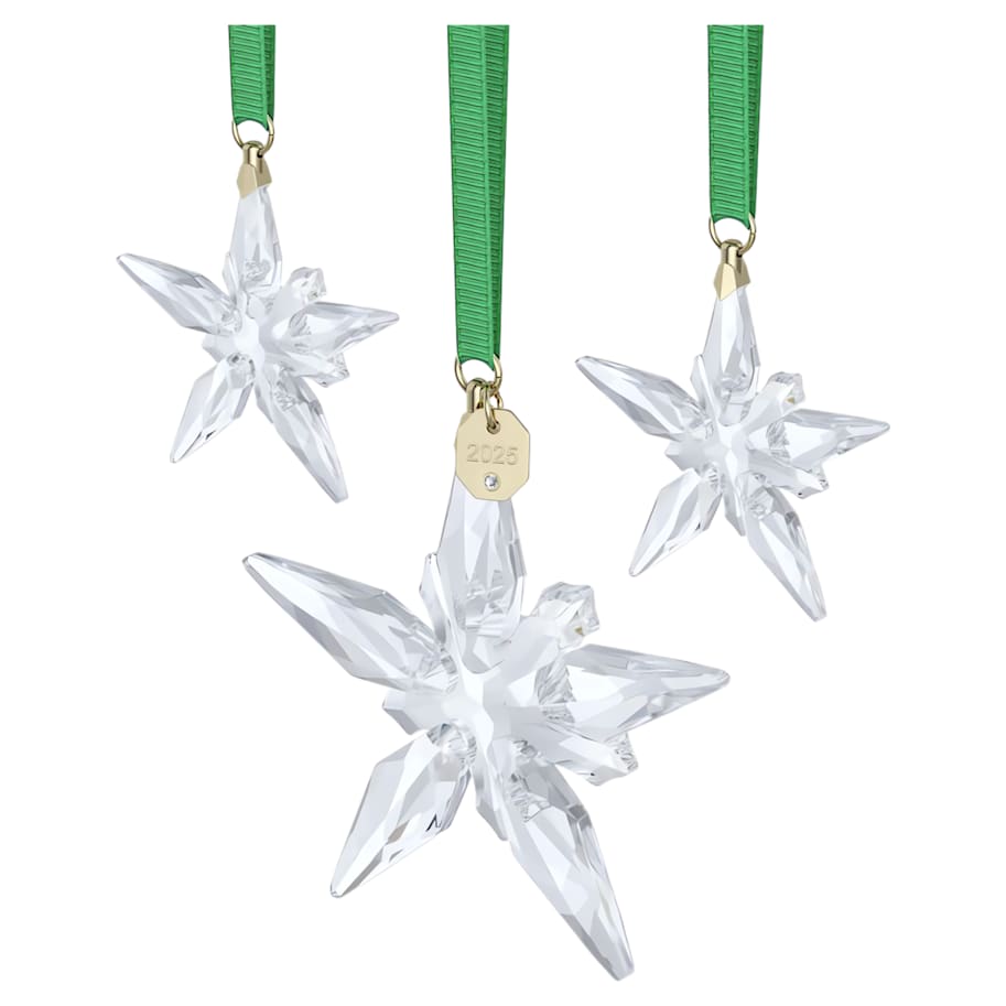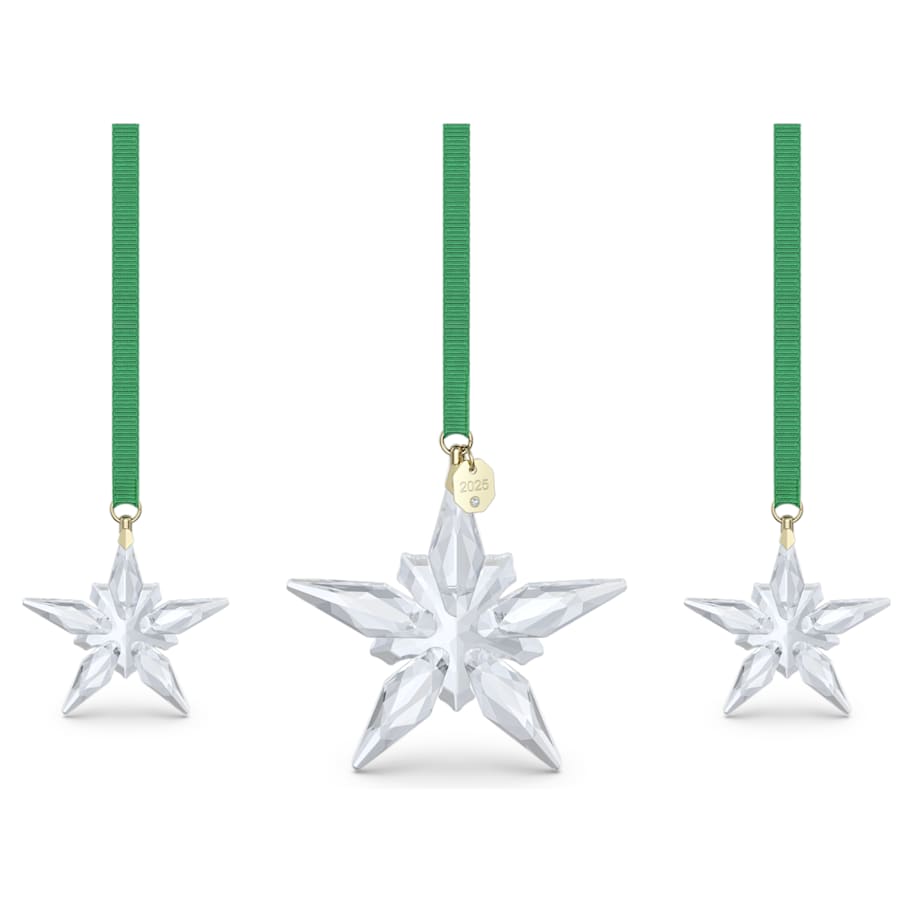 This magical holiday set continues the iconic tradition of Swarovski's Annual Edition Ornaments. The set features three clear stars, crafted with a total of 570 facets, that are inspired by the serenity of the night sky. Each star is suspended from a green grosgrain ribbon with champagne gold-tone plated accents, while the large star also includes a 2025 engraving on the tag. Designed especially for the holiday season, this commemorative set would make a truly elegant gift or take pride of place in your own festive décor. Decoration object. Not a toy. Not suitable for children under 15.