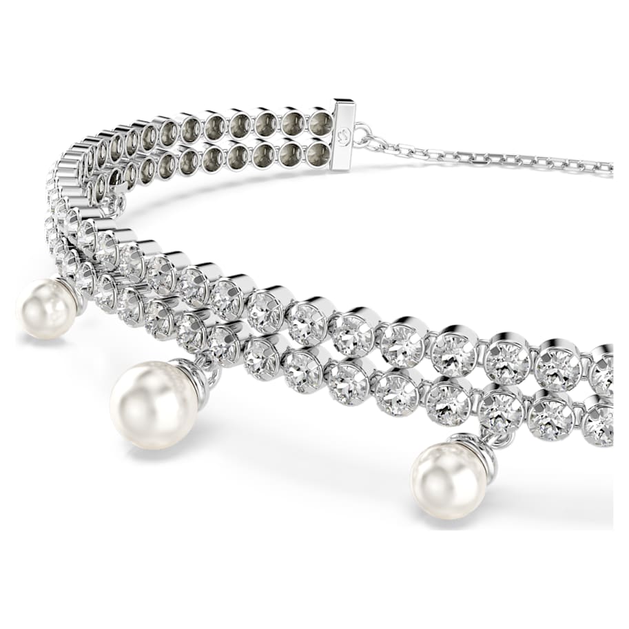 Discover a pure expression of elegance in this refined bracelet. Easily adjustable with a sliding ball closure, the rhodium plated design features two rows of cupchain, set with clear Swarovski Zirconia in round cuts. An adornment of Swarovski Crystal Pearls is then added below for a sensational look of luxury. Pair this bracelet with the matching choker to create your own expressive combination.