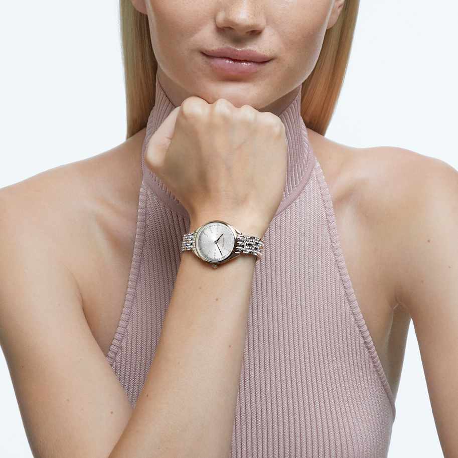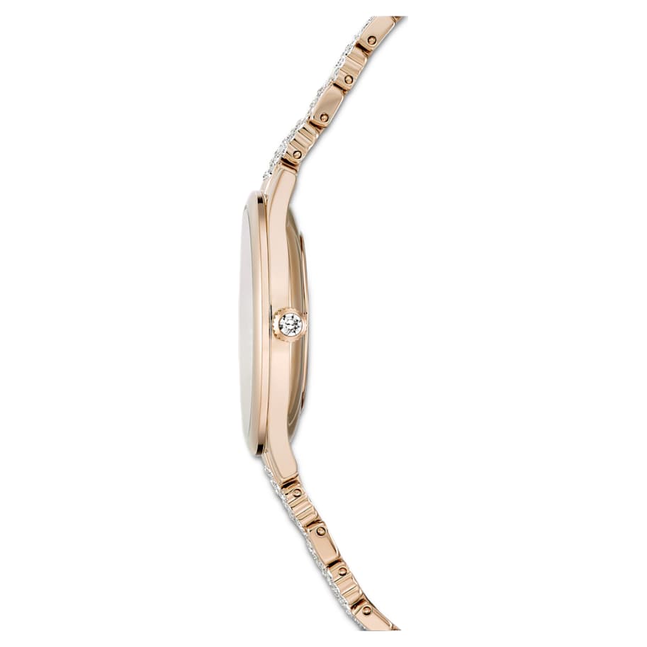 Illuminate your look in this exquisite watch, engineered in champagne gold-tone PVD-coated stainless steel. Sleek and eye-catching, the soft, metal bracelet is trimmed with over 150 clear crystals. The guilloché dial is decorated with modernist, crystal index markers to add a delicate touch of luxurious style to the design. Made in Switzerland, it is water resistant to 50m. Perfect for every day, perfect for nights out. Swiss Made.