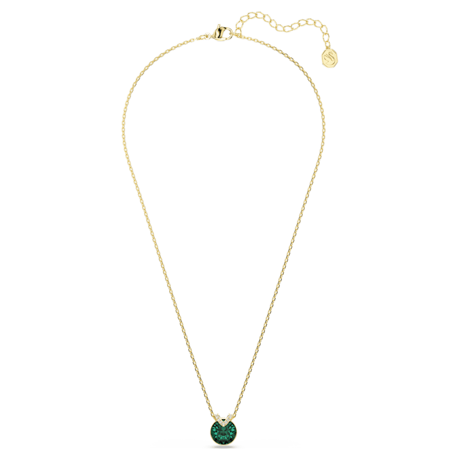 This mesmerizing V-shape pendant has eye-catching appeal thanks to its central green crystal set in gold-tone plating. A flourish of shimmering pavé adds an extra layer of beauty, while the delicate chain exudes pure elegance. Wear it together with the matching earrings for a wondrous combination.