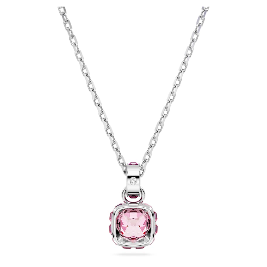 This delicate pendant is inspired by the birthstone of October. Hanging from a fine chain with a shimmering link of crystals, the rhodium plated jewelry features a single square-cut stone in an opal pink hue, representing endless creativity and optimism. This meaningful design makes a magical birthday gift or can be worn to celebrate a time that is significant to you.