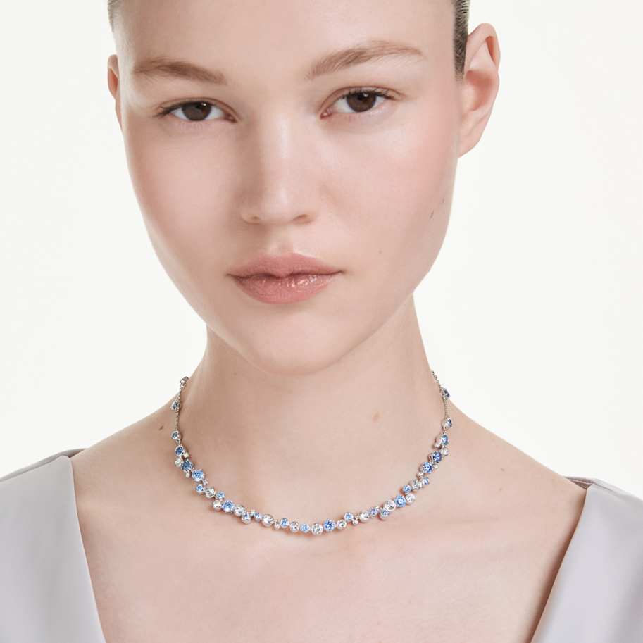 Reflecting the beautiful mysteries of the cosmos, this Constella necklace plays with both color and light. The all-around silhouette showcases a decoration of crystals and Swarovski Zirconia, with a mix of captivating blue shades and clear tones that perfectly match the rhodium plated setting. The lobster clasp allows for an adjustable fit, giving you a wondrous accessory choice for your seasonal celebrations.