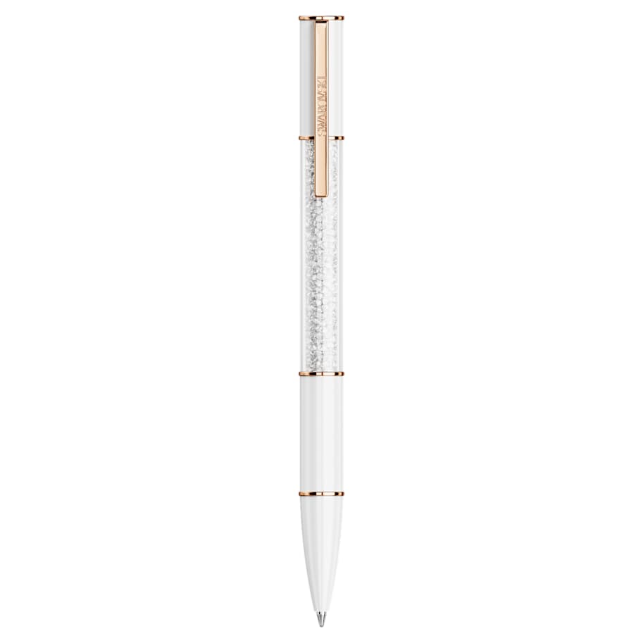 The Crystalline ballpoint pen combines creativity with luxury. This distinctive writing instrument features a round barrel in white, as well as rose gold-tone accents that include a functional clip engraved with the Swarovski name. At its center, this eye-catching design is illuminated with approximately 480 glittering crystals, each meticulously added using the iconic Crystalline technique. A standout addition to your desk or a distinctive gift for the writers in your life. Black and blue ink refills are available to buy in Swarovski stores.