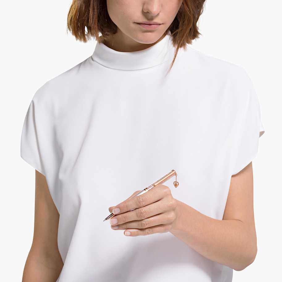 This refillable ballpoint pen by Swarovski features a powerful and romantic design. The color scheme of rose-colored lacquered metal and rose-gold tone plating lends it an air of elegance. Numerous Swarovski crystals fill the pen, making it sparkle brilliantly. A small, heart-shaped charm showing the word 'LOVE' is surrounded by beautiful crystals. The perfect romantic gift for a special someone. Refills of black and blue inks are available in Swarovski stores.