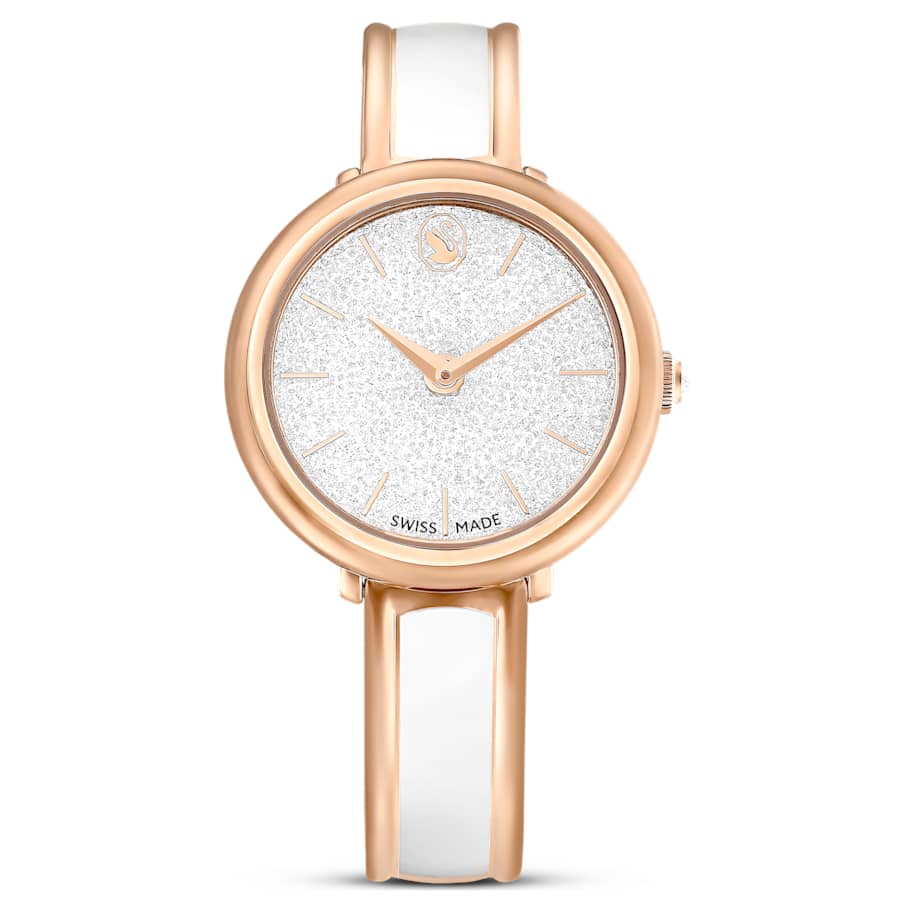 Part jewelry, part timepiece, this Crystalline watch is a glittering everyday accessory. The 32mm stainless steel design is rose gold-tone finished and is worn around the wrist on an adjustable bangle that features an elegant mid-section in white enamel. In a sublime example of Swarovski’s Crystalline technique, the dial is decorated with around 1,016 crystals, which shimmer between the slender hour markers and Swan logo at 12 o’clock. An additional crystal is also placed within the crown. This Swiss made watch is water resistant to 50 meters and delivers scintillating style at all hours of the day.