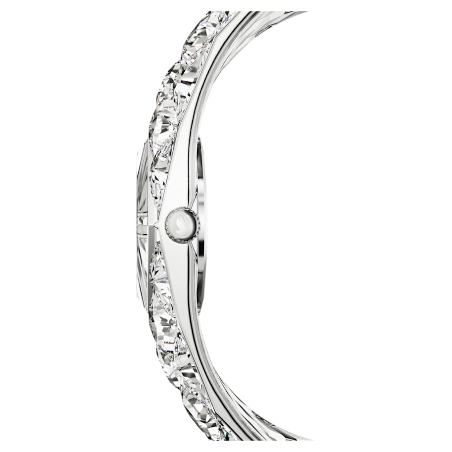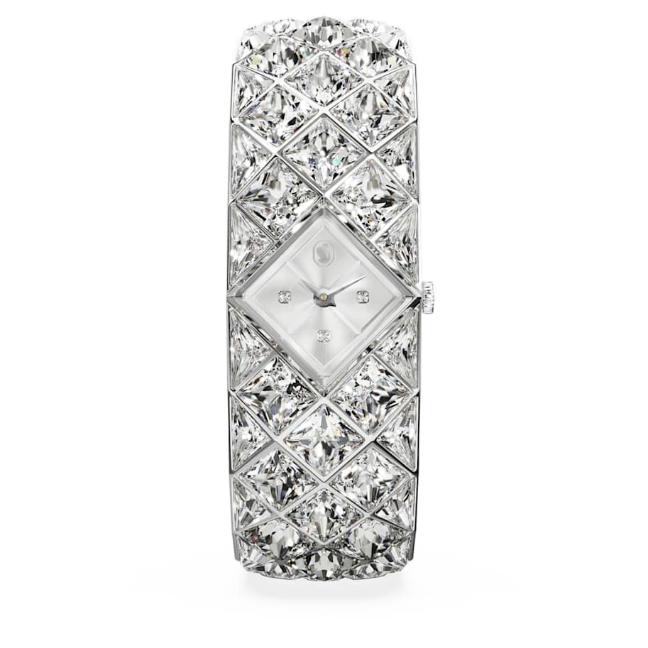 With a total of 47 crystals, the luxurious spirit of Curiosa is beautifully expressed in this bangle-style timepiece, which showcases Swarovski's heritage and savoir-faire. The stainless steel design is a vintage-era tribute, featuring a 20mm (w) x 20.5mm (l) case that sits neatly within a stunning bracelet set with triangle- and fancy-cut crystals. The dial also includes crystals at the quarter hour markers. A glowing accessory for your most sophisticated occasions, this watch is water resistant to 50 meters and reveals the iconic Swan logo at 12 o’clock.