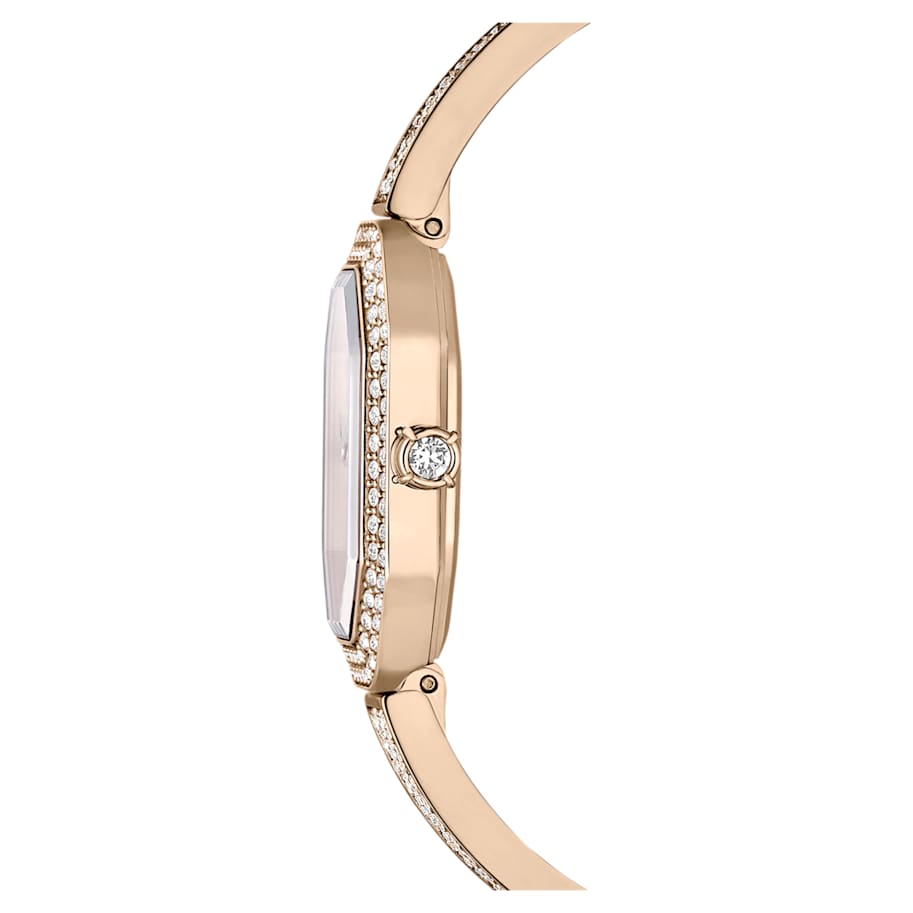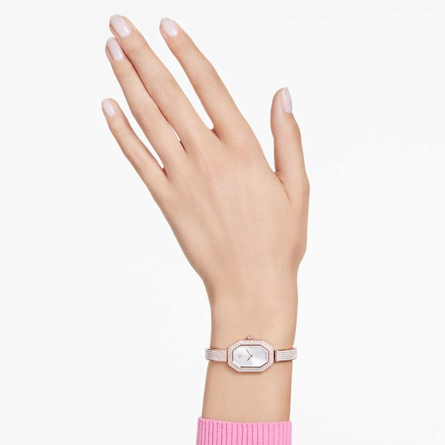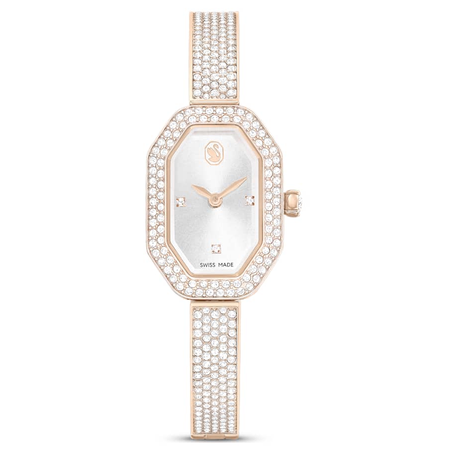 Capturing the beauty of Swarovski’s iconic octagon shape, this Dextera bangle watch offers a meticulous display of symmetry around the wrist. The 20mm x 30.5mm case features a champagne gold-tone finish and is adorned with a pavé of 92 crystals on the bezel. This provides a perfect frame for the sunray dial, which features a swan logo at 12 o’clock and three crystallized index markers. Along with a single dazzling stone set in the crown, the watch is also brought to life by 194 crystals set along the adjustable bracelet, providing exceptional beauty at every hour. This Swiss made watch is water resistant to 30m and combines joyful extravagance with signature Swarovski savoir-faire.