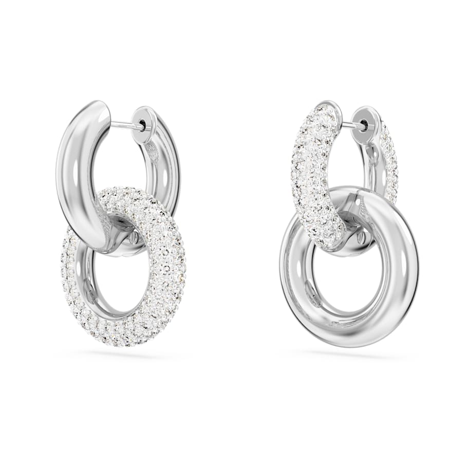 These Dextera interlinked hoops feature two rhodium plated tubular rings, one with all-over pavé. To add an asymmetrical touch, the positioning of the rings is different on each piece, and for added versatility you can detach the second hoop for a single hoop style.