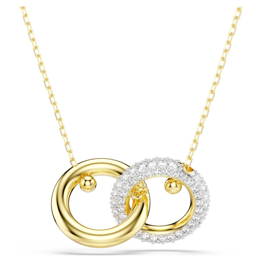 Embrace the spirit of unity with this pendant from the Dextera family. The gold-tone plated design features two interlinked tubular rings, one shimmering with all-over pavé. The delicate chain includes a single Swarovski Zirconia adorning the end for added luxury. Combining bold shapes with radiant clear crystals, this spellbinding piece will maximize your style.