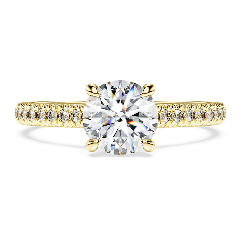 Every detail of this radiant Eternity ring has been crafted to catch the light. The 14K yellow gold design is detailed with small laboratory grown diamonds, while a round, prong-set laboratory grown diamond sits at the center – all totaling 1.2 carat. An elegant piece of beauty that makes a sensational engagement choice. This jewelry is IGI (International Gemological Institute) certified and is part of the Eternity collection.