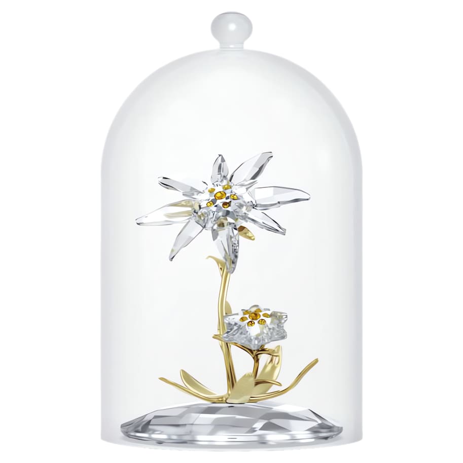 Created to celebrate Swarovski’s 130th anniversary, this wondrous bell jar is dedicated to the original Edelweiss emblem. The flowers themselves reveal a total of 259 precision-cut facets, with yellow pistils, and glossy stems and leaves in champagne gold-tone metal. Protected and displayed beneath a glass bell, this special creation is a showcase of Swarovski’s finest savoir-faire and enduring heritage. Decoration object. Not a toy. Not suitable for children under 15.