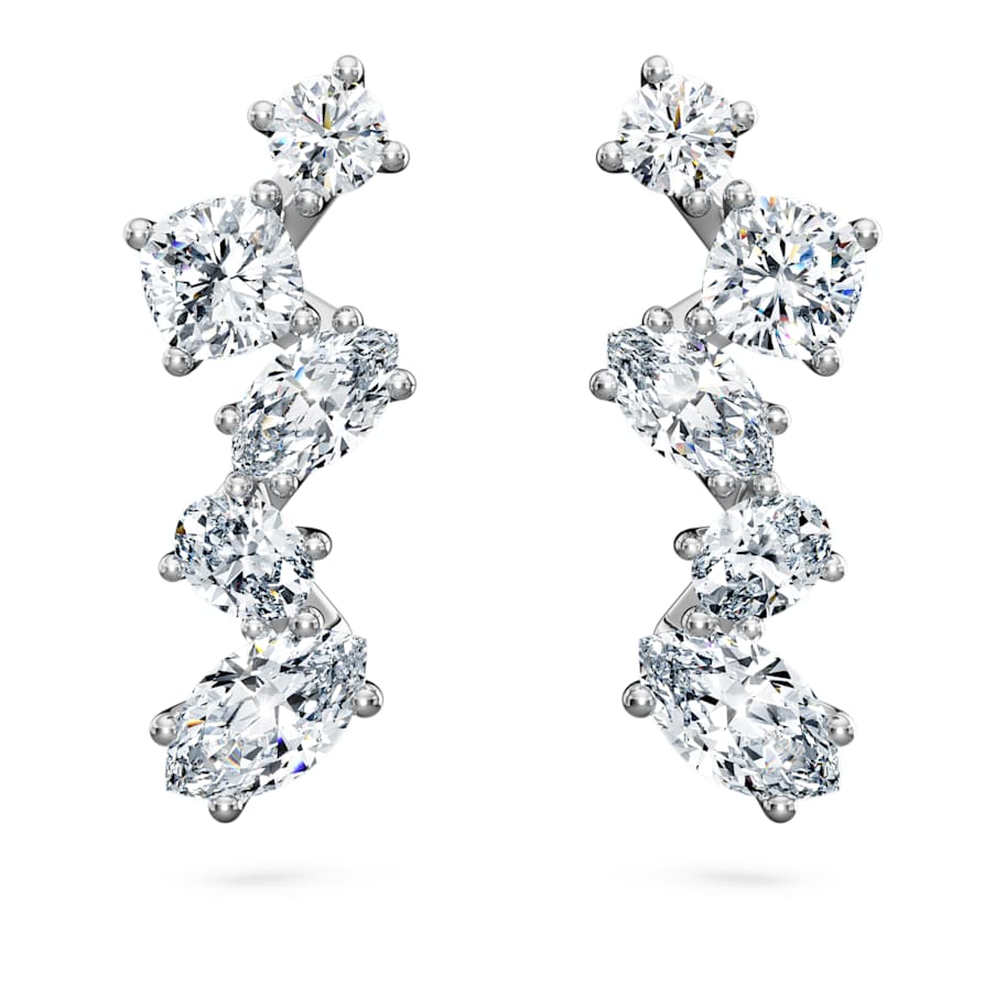With a beautiful cascading design, these shimmering pierced earrings will add exquisite light to any look. Each 14K white gold piece features five laboratory grown diamonds in various fancy shapes that are artfully arranged in a zigzag drop. Wear them with a matching necklace or ring to add extra drama. This jewelry is IGI (International Gemological Institute) certified and is part of the Galaxy collection created by Giovanna Engelbert.