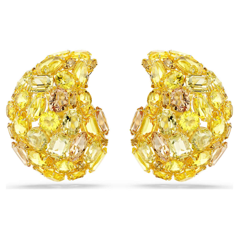 Like two drops of golden sunshine, these bright clip earrings are a joyful accessory. Each gold-tone plated piece reveals a collision of crystals in various cuts and yellow and amber tones. A pair that is emblematic of Gema’s unexpected formations and vibrant beauty, they glow even brighter when worn alongside matching jewelry pieces from the same family.