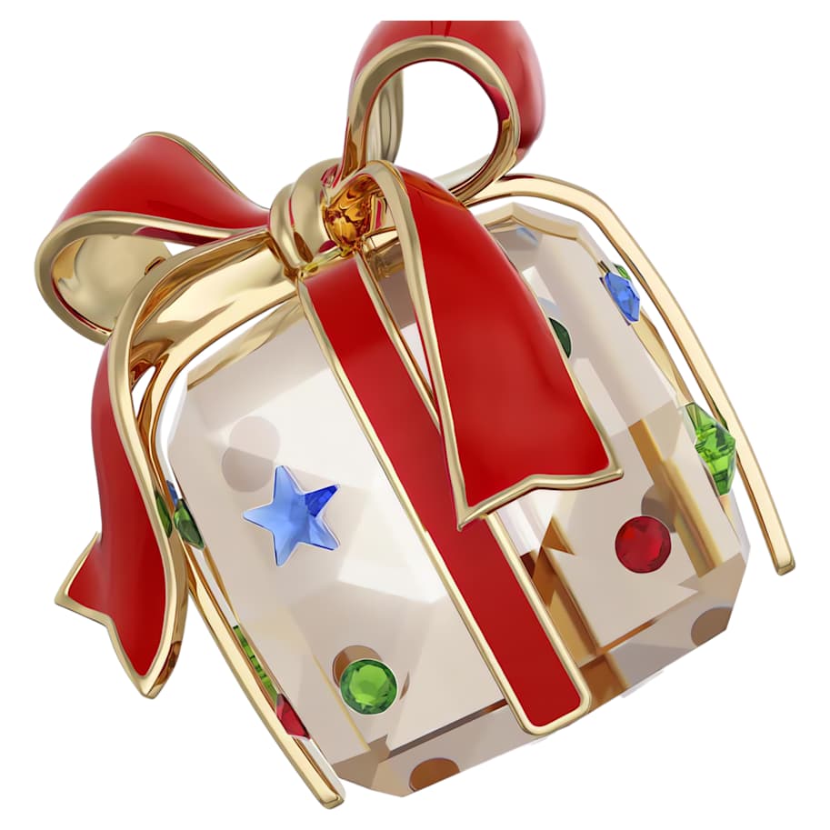 This playful gift-wrapped ornament is an ideal addition to any festive tree. Suspended from a red grosgrain ribbon, the parcel design is crafted with Swarovksi’s Golden Shadow effect and 426 facets, while also featuring decorative crystals in red, green, and blue. The ribbon is neatly formed from champagne gold-tone metal with a red lacquer. Add this ornament to your own seasonal display or gift it to someone special for a touch of holiday joy. Decoration object. Not a toy. Not suitable for children under 15.