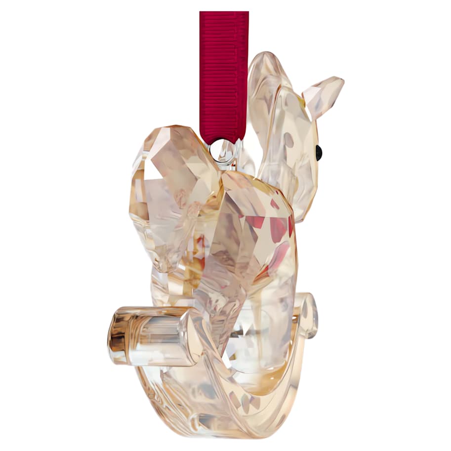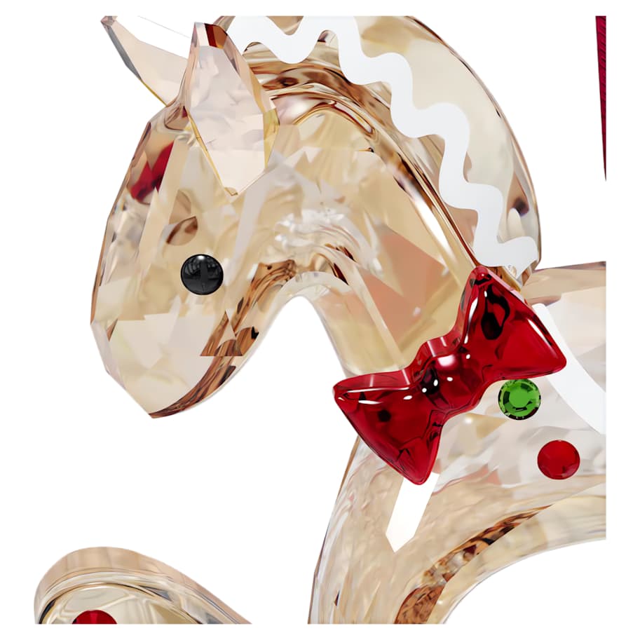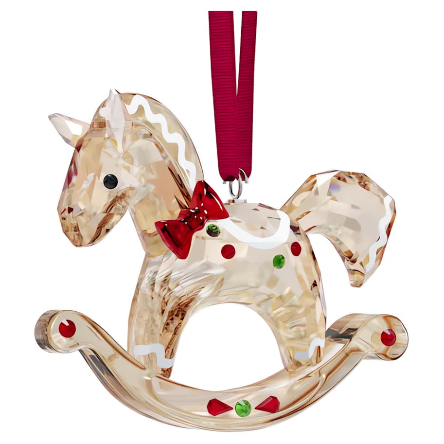 Evoke memories of holidays past with this festive rocking horse ornament. Designed to look like a gingerbread cookie, it shines with 325 facets of gold-toned crystal with white print detailing and red and green crystal accents. Hanging on a red grosgrain rayon ribbon, it will make a cute and charming gift or addition to your tree, especially when combined with the other pieces in the nostalgic Holiday Cheers collection. Decoration object. Not a toy. Not suitable for children under 15.