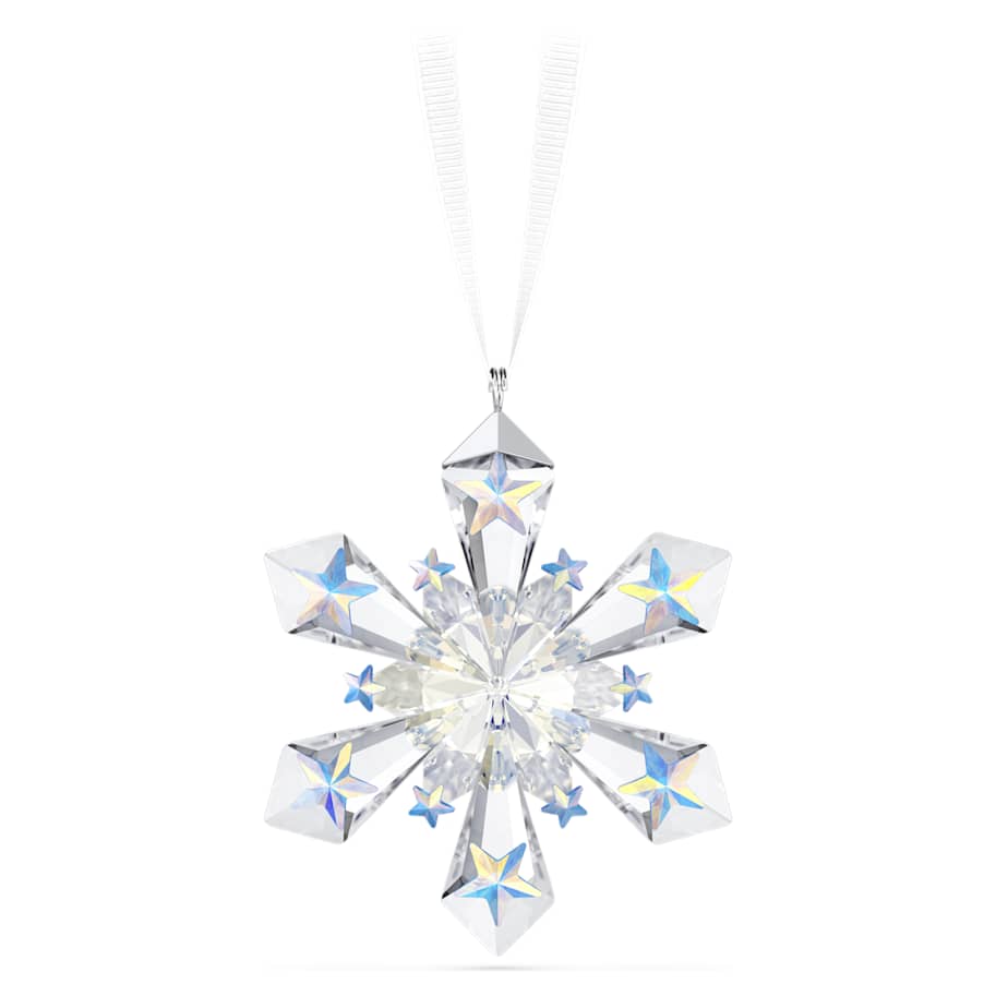 A dazzling star lies at the heart of any holiday décor. This shimmering piece offers a fresh interpretation of the classic motif with 288 radiant facets and silver-tone metal accents. Twelve flatback stars in large and small sizes surround the center, each produced with Swarovski’s mesmerizing Aurora Borealis effect. Suspended from a white grosgrain ribbon, this ornament is a wondrous piece that will bring joy throughout the season. Decoration object. Not a toy. Not suitable for children under 15.