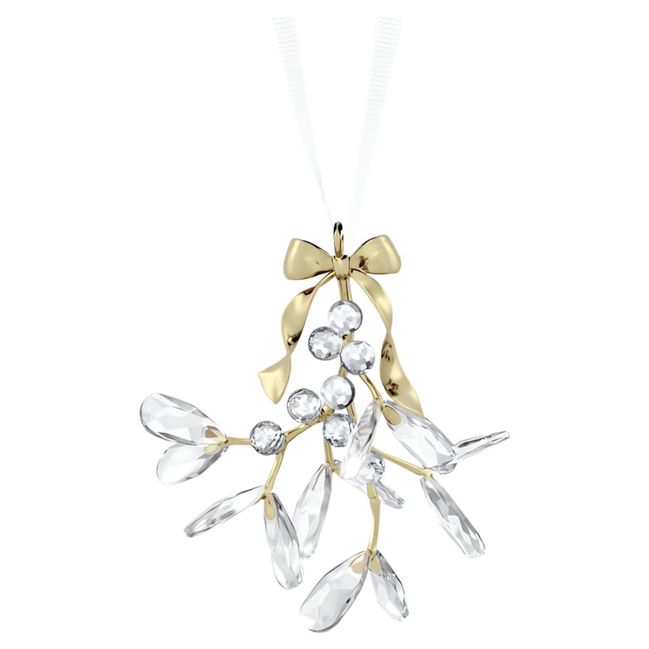This luxurious ornament is the perfect excuse to share a festive kiss. Suspended from a white grosgrain ribbon, the traditional mistletoe is crafted in glossy champagne gold-tone metal, with radiant clear crystals used for the leaves and berries. With a total of 1,104 facets, the design will create endless light reflections across your holiday décor. Hang it somewhere prominent to celebrate the joy of the season. Decoration object. Not a toy. Not suitable for children under 15.