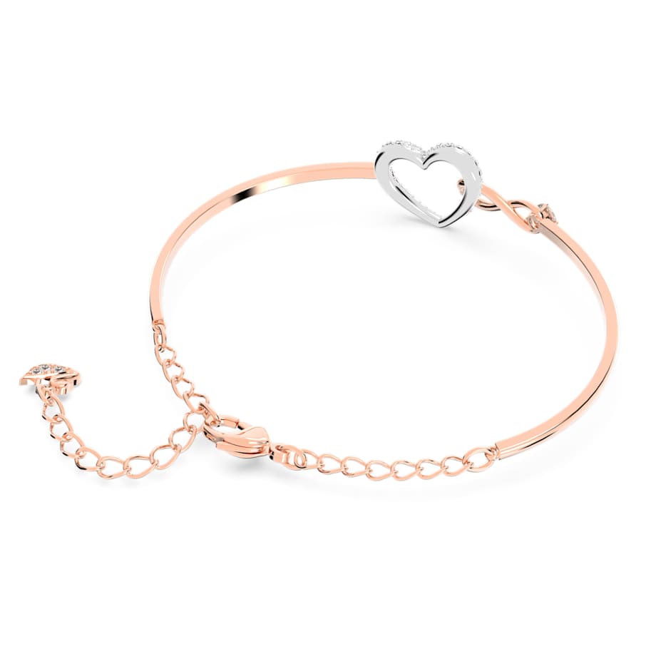 A symbol of infinite love: This elegant Swarovski bangle showcases the symbols of love and eternity entwined with each other. Embellished with white Swarovski crystals, the heart motif perfectly complements the infinity symbol for a truly romantic look. A mixed metal finish balances warm and cold tones perfectly to complete the design. It is a wonderful gift – and a promise – for a special person.