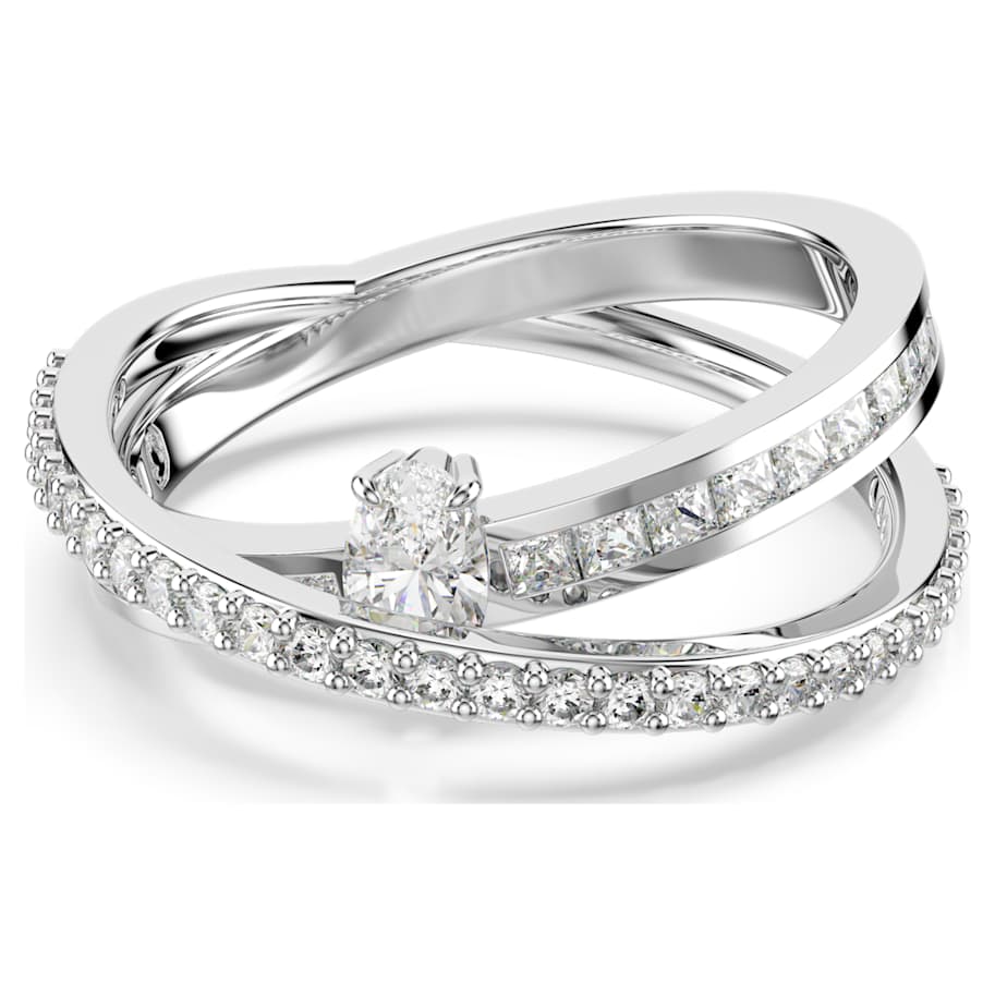 This twisting Hyperbola ring integrates multiple styles in one beautifully compact design. Its two overlapping rhodium plated bands are adorned with clear Swarovski Zirconia in channel and prong settings. An additional oval-cut crystal is placed in between for added impact. Pair with a matching bangle for a truly showstopping look.