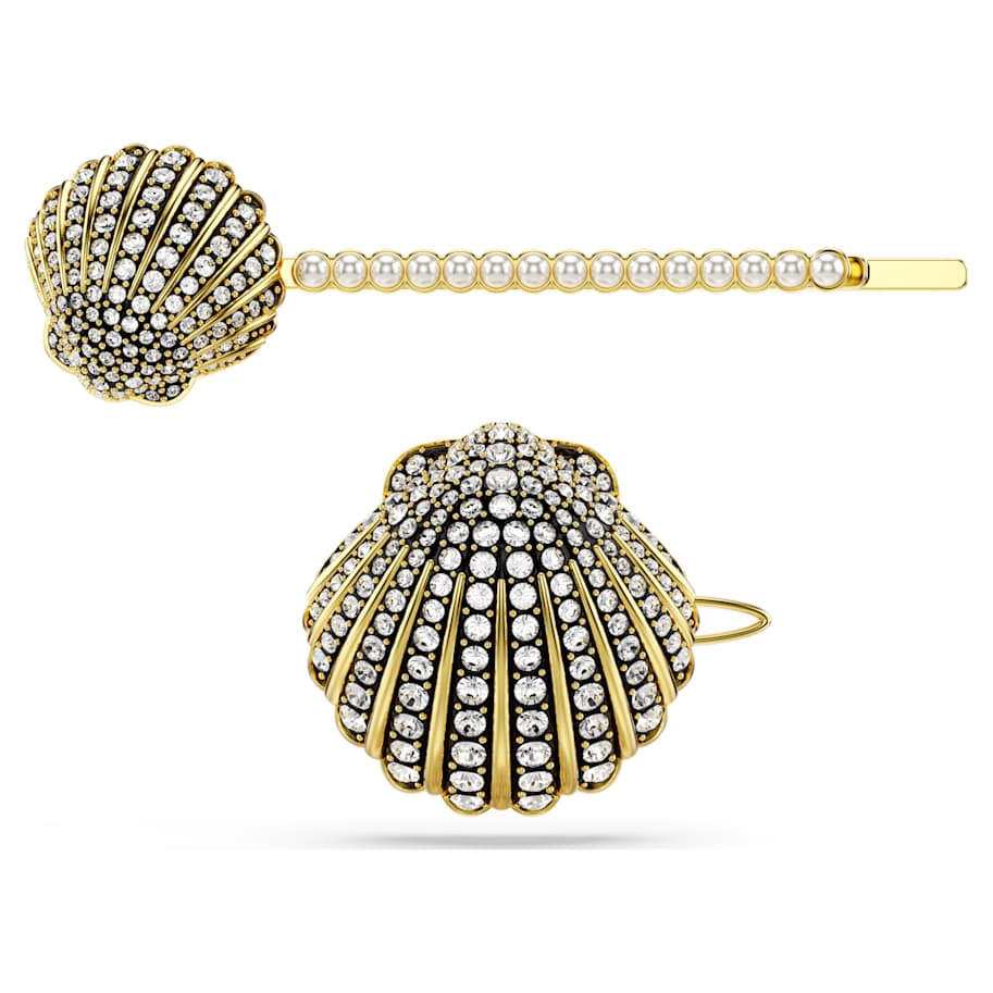 These ocean-inspired hair accessories take maritime chic to the next level. The gold-tone plated set contains a small pin decorated with micro pearls on the barrette, along with a large clip. Both pieces feature a shell motif, artistically adorned with clear round crystals. Arrange them any way you wish to create a look that is infused with natural beauty.