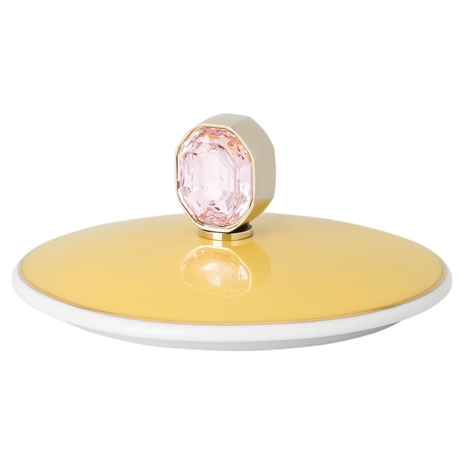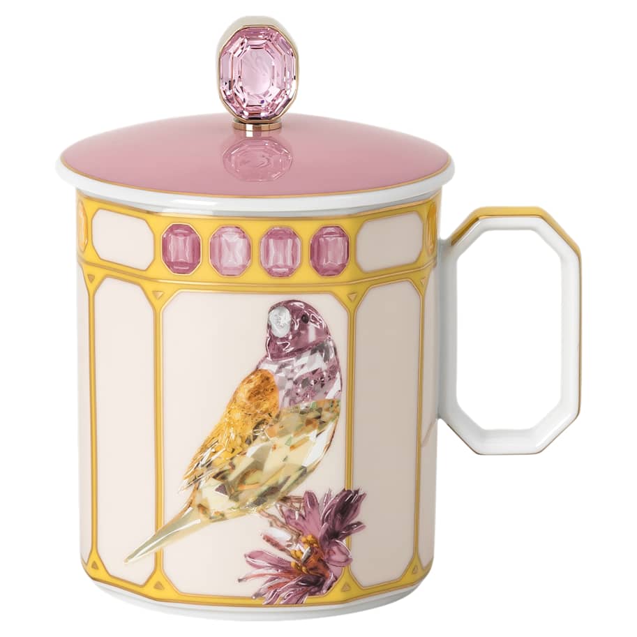 Embrace the majesty of nature with this faceted mug from the Idyllia collection. Using an exclusive technique, the yellow and marshmallow porcelain is printed with two motifs that capture the essence and radiance of crystals. This includes a colorful finch on one side, and a bright bouquet of flowers on the other. Created in partnership with porcelain brand Rosenthal, the mug is further decorated with fine gold-tone lines and an octagonal pink crystal on the lid. This product is dishwasher safe, except for the lid, and should not be used in a microwave.