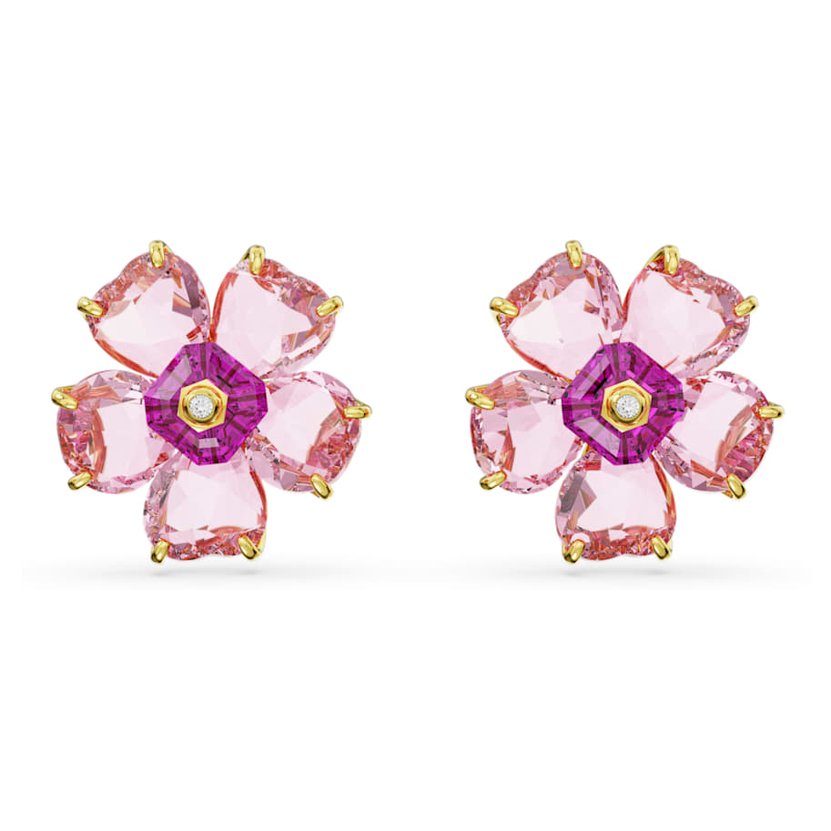 Inspired by the wondrous beauty of florals, these pierced earrings are waiting to be picked. Set on gold-tone plating, the alluring design is made from an array of pink crystals arranged as petals around a stone in a deeper hue. A captivating design to harness the wonder of nature.