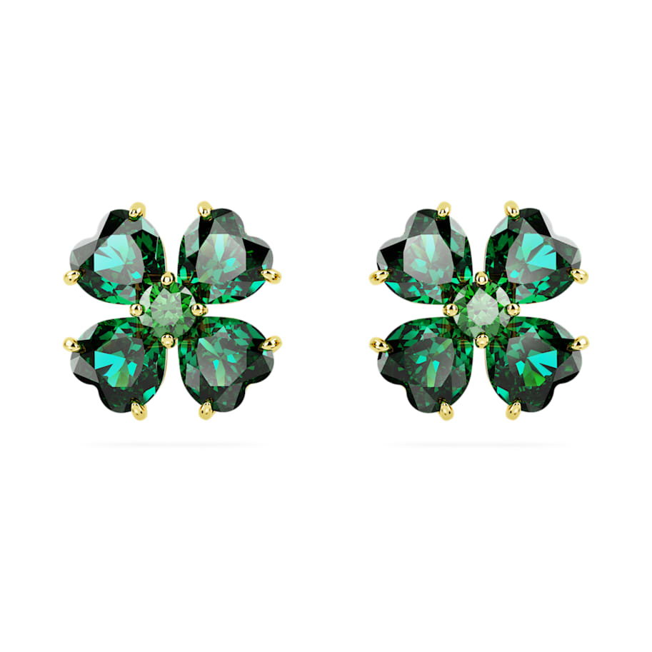 From the magical world of Idyllia, these radiant stud earrings are styled to bring you luck. Each gold-tone plated piece features a green clover motif crafted from four heart-shaped crystals arranged around a central stone. Wear them alone for a fun touch of glam, or enhance the impact with matching jewelry from the same wondrous family.