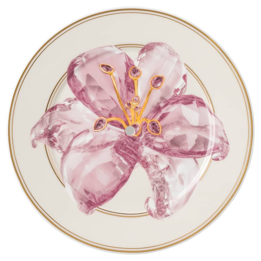 Make an elegant statement at your next afternoon tea with this two-tier étagère. Using an exclusive technique, the marshmallow porcelain is printed with two wondrous motifs that capture the essence and radiance of crystals. This includes a lily and citron pattern on the lower tier, and a bright pink lily on the upper tier. Created in partnership with porcelain brand Rosenthal, it is further decorated with fine gold-tone lines and a pink crystal handle. This étagère should be hand-washed, and is not suitable for use in a microwave.