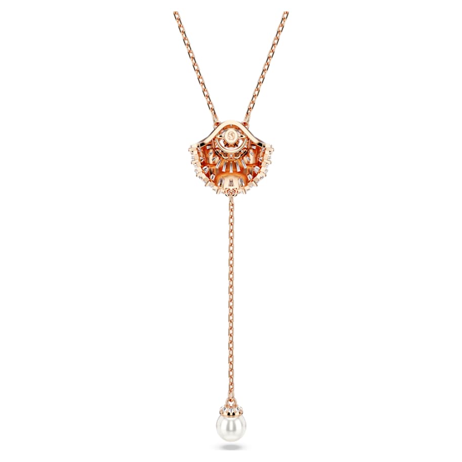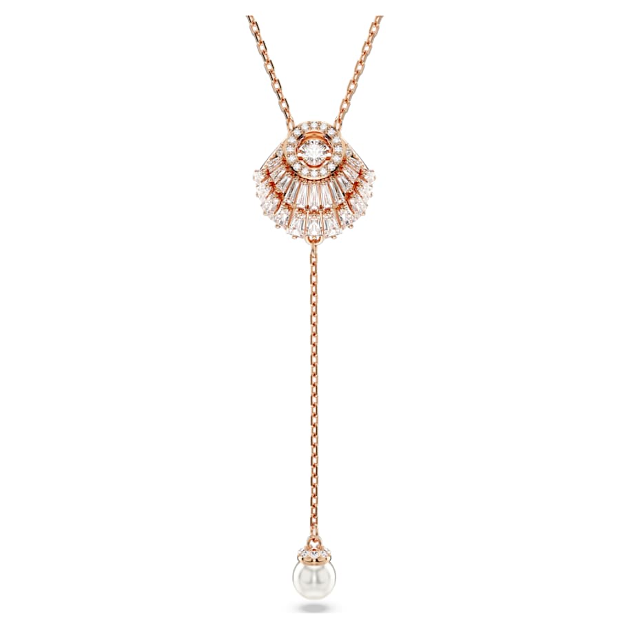 Embrace the tranquility of the sea with this ocean-inspired pendant from the Idyllia family. The shell design is rose gold-tone plated and embellished with an array of clear Swarovski Zirconia and a clear round dancing crystal that catches the light. Worn on a delicate chain, the jewelry is completed by a single white Crystal Pearl that elegantly hangs beneath. A calm and radiant addition to your everyday style.