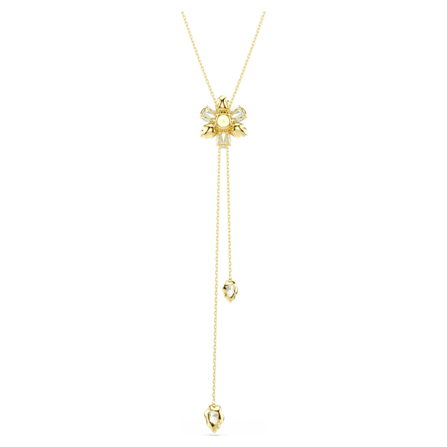 Choose magic and wonder with this radiant V-shaped pendant from the Idyllia garden. Suspended from a delicate chain, the central motif is shaped like a flower, with bright green petals produced in different shapes and shades. Two additional crystals hang below in pink and green, while the sliding mechanism allows you to adjust the fit with ease. A joyful way to accessorize your style, or a playful gift for someone you love.