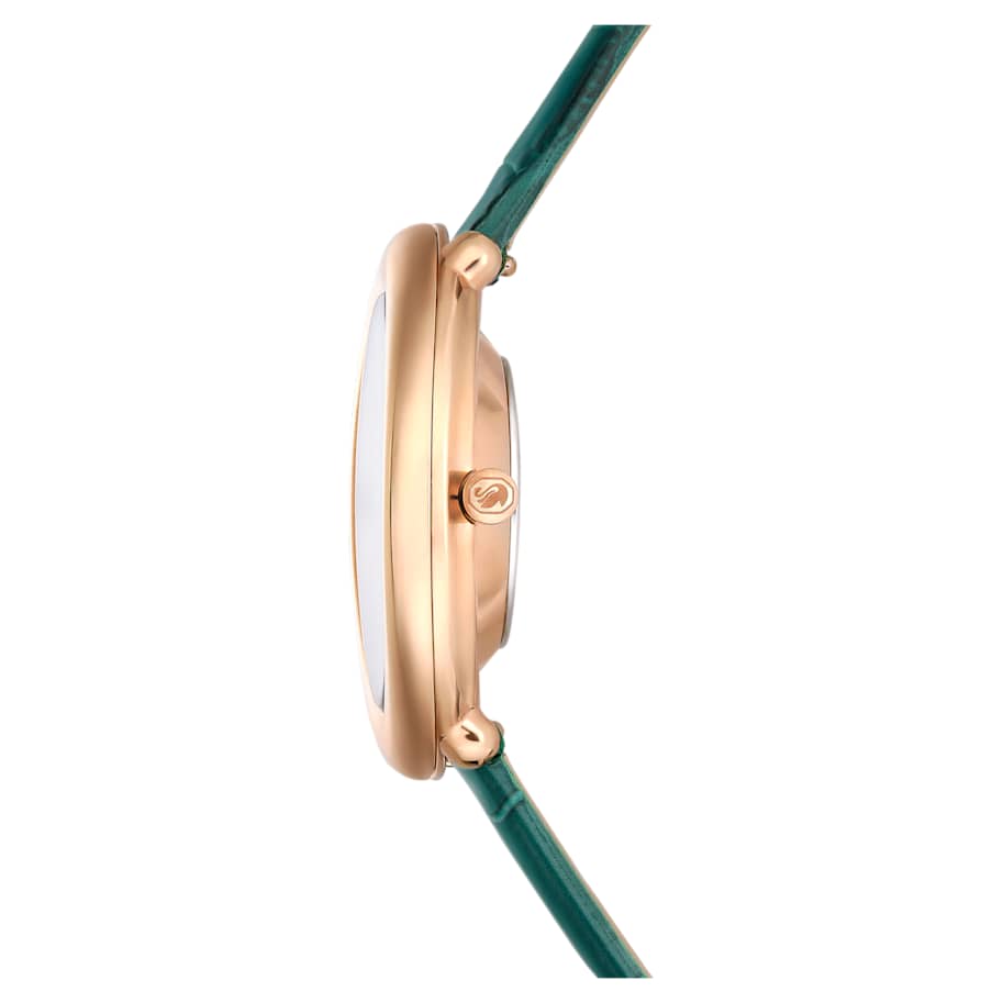 The Imber timepiece conveys a modern approach to watchmaking through its glittering dial and timeless elliptical shape. This 24 x 26.3 mm stainless steel version is rose gold-tone finished and features around 1000 clear crystals on its Crystalline dial. Amongst the slender hour markers, a single Roman numeral is displayed at 6 o’clock, while Swarovski’s iconic swan is placed at 12 o’clock. The Swiss Made watch is worn on a green leather strap with crocodile print and offers a water resistance of 50m. Make this your go-to choice for sophisticated day-to-night styling.