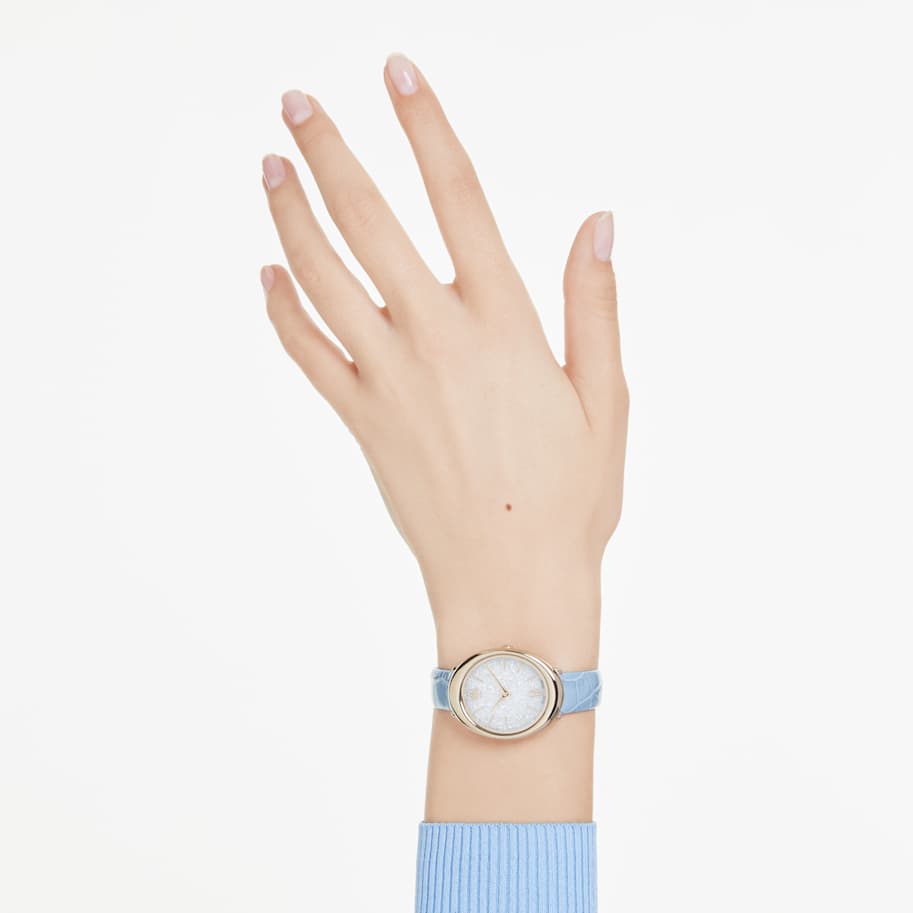 The Imber timepiece conveys a modern approach to watchmaking through its glittering dial and timeless elliptical shape. This 24 x 26.3 mm stainless steel version is champagne gold-tone finished and features around 1000 clear crystals on its Crystalline dial. Amongst the slender hour markers, a single Roman numeral is displayed at 6 o’clock, while Swarovski’s iconic swan is placed at 12 o’clock. The Swiss Made watch is worn on a blue leather strap with crocodile print and offers a water resistance of 50m. Make this your go-to choice for sophisticated day-to-night styling.