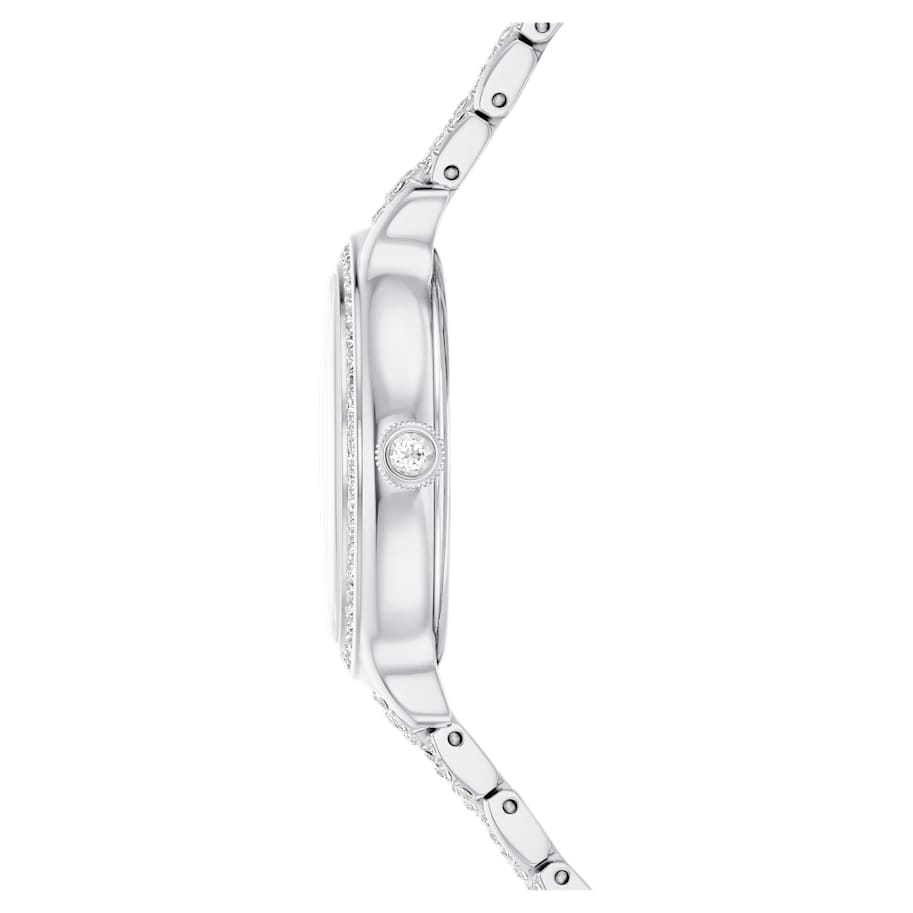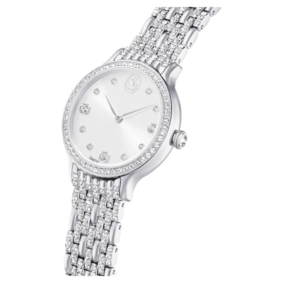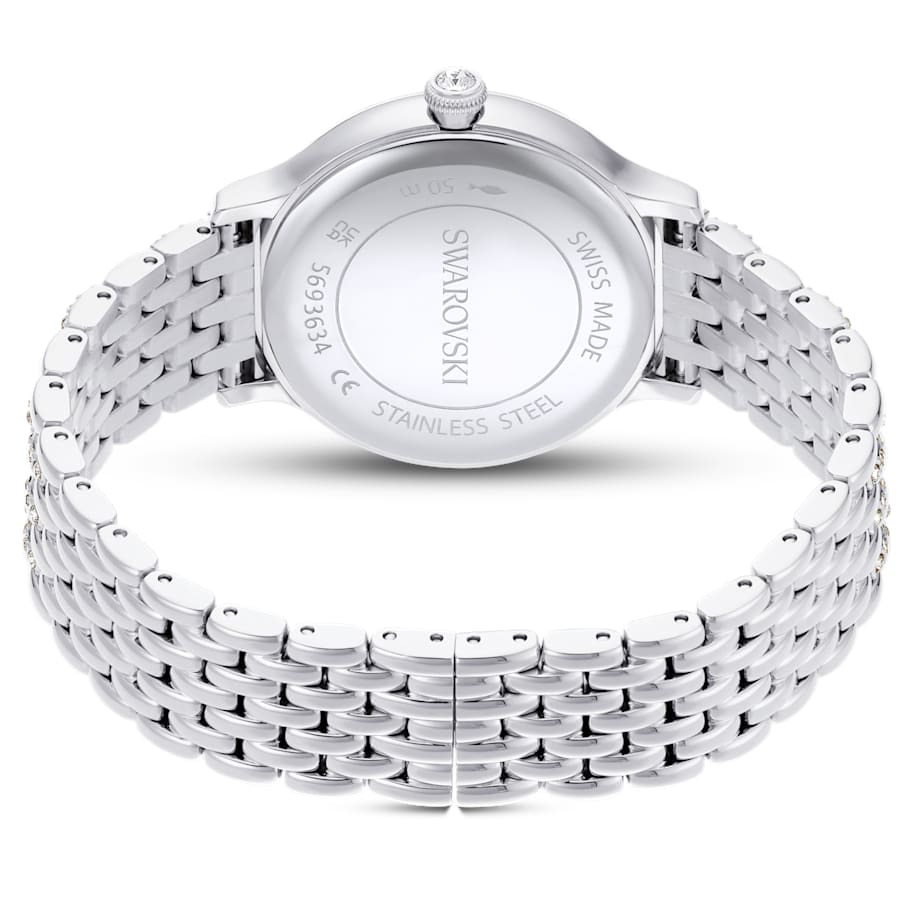 Adorned with 232 individual crystals, this glistening Imber watch is Swarovski’s finest expression of timeless elegance. The 31mm stainless steel design features a pavé bezel set with 52 clear crystals, while one additional crystal is also placed within the crown. On the sunray dial, 11 crystals in small and large sizes are used to mark the hours, along with a swan logo at 12 o’clock. Around the wrist, the watch’s most distinctive feature is the adjustable seven-link bracelet, which is stunningly set with 168 round-cut crystals. This Swiss Made watch is water resistant to 50 meters and matches seamlessly with Swarovski’s selection of Imber jewelry.