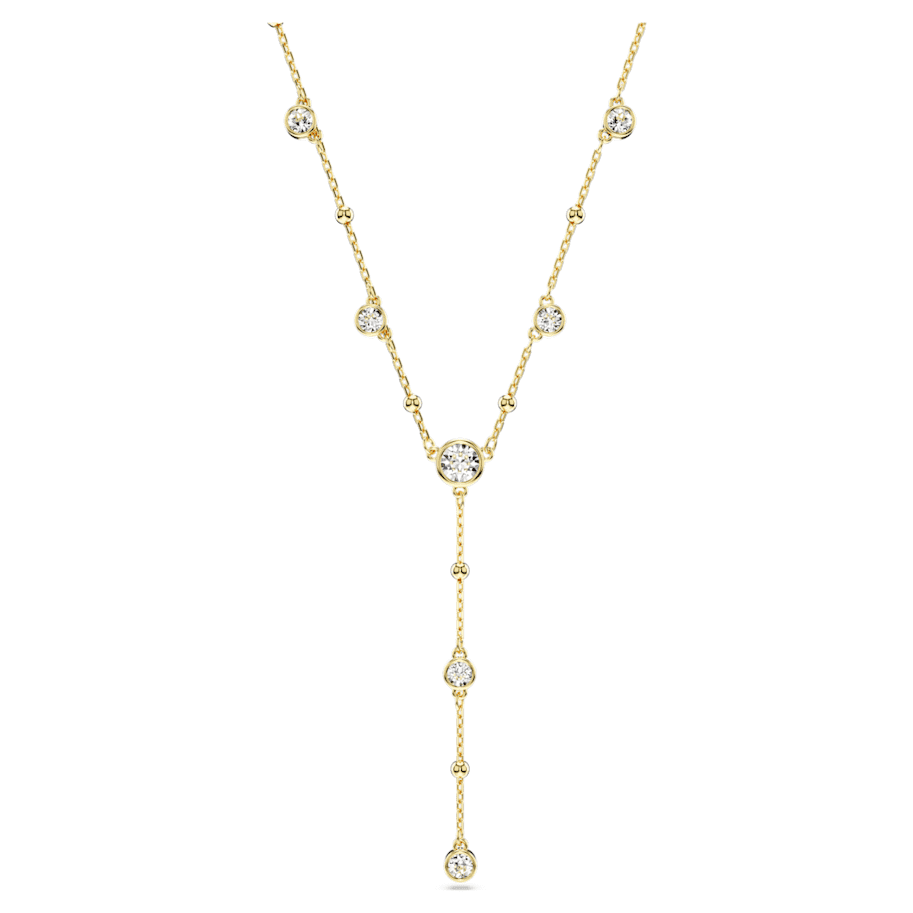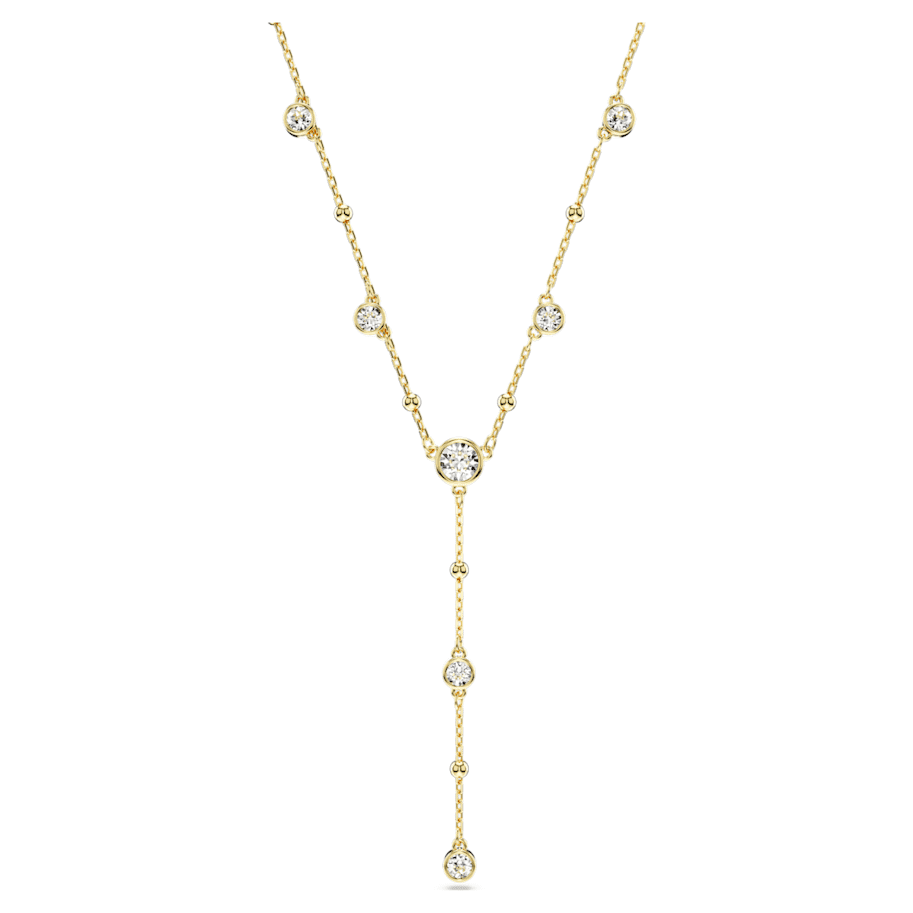 With its distinctive shape, this Imber necklace makes a perfect addition to your jewelry. The design features a gold-tone plated chain, accented with an array of shiny metal droplets and dazzling round-cut crystals in a puffy bezel setting. A delicate strand drops elegantly in the middle, while a single Swarovski Zirconia is placed in the elongation for added luxury. Pair this piece with some Imber earrings for an eye-catching style match.