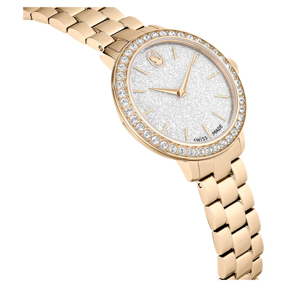 Inspired by Swarovski’s Matrix jewelry, this 30mm timepiece captures the same sense of contemporary and expressive styling. The stainless steel design is champagne gold-tone finished and features a pavé bezel set with 42 crystals. The beautifully round dial is given a glitter effect and includes slender hour markers and hands, as well as a swan logo at 12 o’clock. Along with an additional crystal set within the crown, this watch is notable for its three-link bracelet, which glides elegantly around the wrist. The Swiss Made timepiece is water resistant to 50m and is the perfect companion for any occasion.