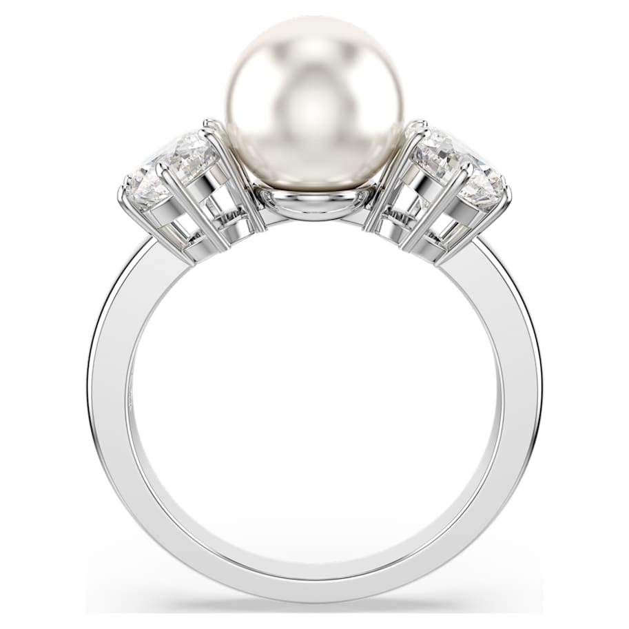 This refined Matrix cocktail ring delivers a fresh twist on a classic silhouette. The rhodium plated design is distinguished by a white Swarovski Crystal Pearl at the center, accompanied either side by prong-set Swarovski Zirconia. A luxurious piece offering instant elegance.