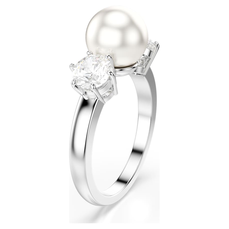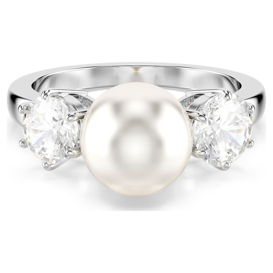 This refined Matrix cocktail ring delivers a fresh twist on a classic silhouette. The rhodium plated design is distinguished by a white Swarovski Crystal Pearl at the center, accompanied either side by prong-set Swarovski Zirconia. A luxurious piece offering instant elegance.