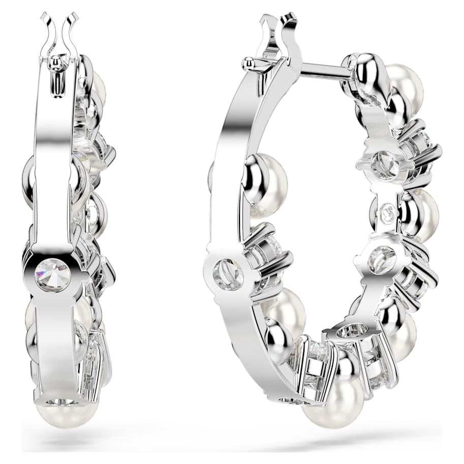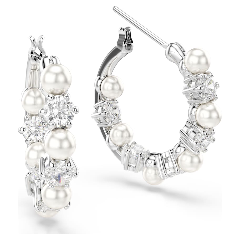 These pierced Matrix earrings are a unique and contemporary twist on the classic hoop style. Each piece is rhodium plated and adorned with alternating Swarovski Zirconia and Swarovski Crystal Pearls. They’re a statement of sophistication that will take any outfit from ordinary to outstanding.