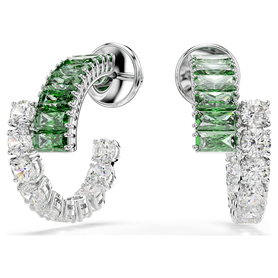 These luxurious Matrix earrings were crafted for a vivid glow. Each small hoop is rhodium plated and features an overlapping design set with clear and green Swarovski Zirconia in round and baguette cuts. A joyful choice for day-to-night styling, these earrings can be paired with a matching ring or bangle to accentuate the color in your style.
