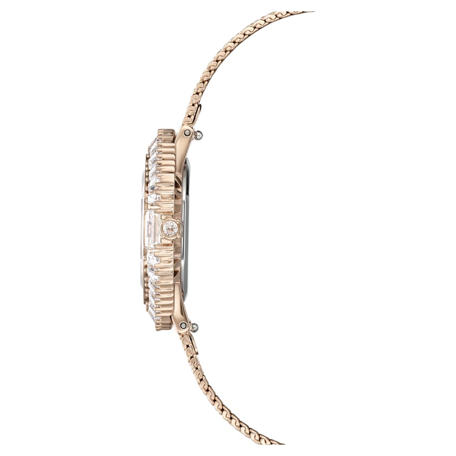 This innovative timepiece is a one-of-a-kind creation that combines signature design with mastery of light. Crafted with genuine savoir-faire, the watch is inspired by the Matrix jewelry family and features a 13 x 18 mm stainless steel case with a champagne gold-tone finish. The bezel is presented in the House's signature octagon shape and is set with a stunning mix of 78 round and fancy cut crystals and Swarovski Zirconia. This provides a radiant frame for the minimalist sunray dial, which elegantly displays three crystal hour markers and a swan logo. A single crystal is also placed within the crown, while around the wrist, the luxury is heightened further by an adjustable mesh bracelet. This watch is water-resistant to 50m and symbolizes Swarovski’s modern luxury at its finest.