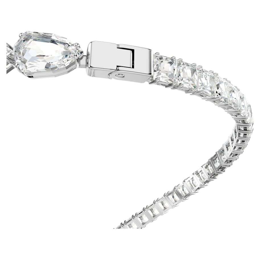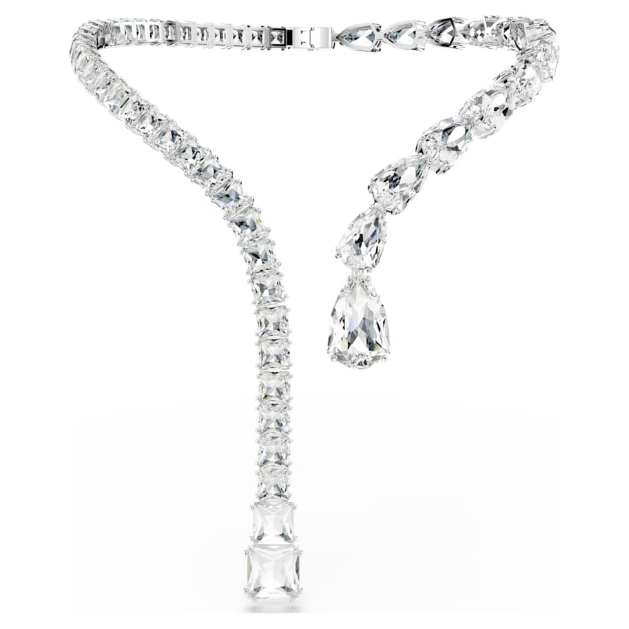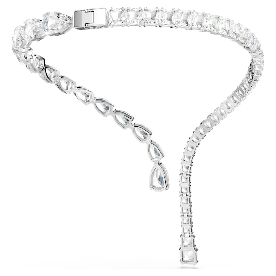 With its elegant curves and all-around radiance, this Matrix necklace is the definition of a statement style. The rhodium plated design is adorned with a variety of clear crystals in pear and square cuts, with multiple sizes adding unexpected dimensions to the silhouette. Choose this piece for instant opulence and glamour.
