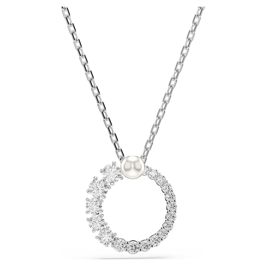 With its classic silhouette and contemporary detailing, this elegant Matrix pendant will attract attention. Suspended from a delicate chain, the rhodium plated piece features a ring of clear Swarovski Zirconia in different sizes, ranging from small to large, bookmarked with a white Swarovski Crystal Pearl at the center. Style solo or stack with matching earrings to dial up the drama.