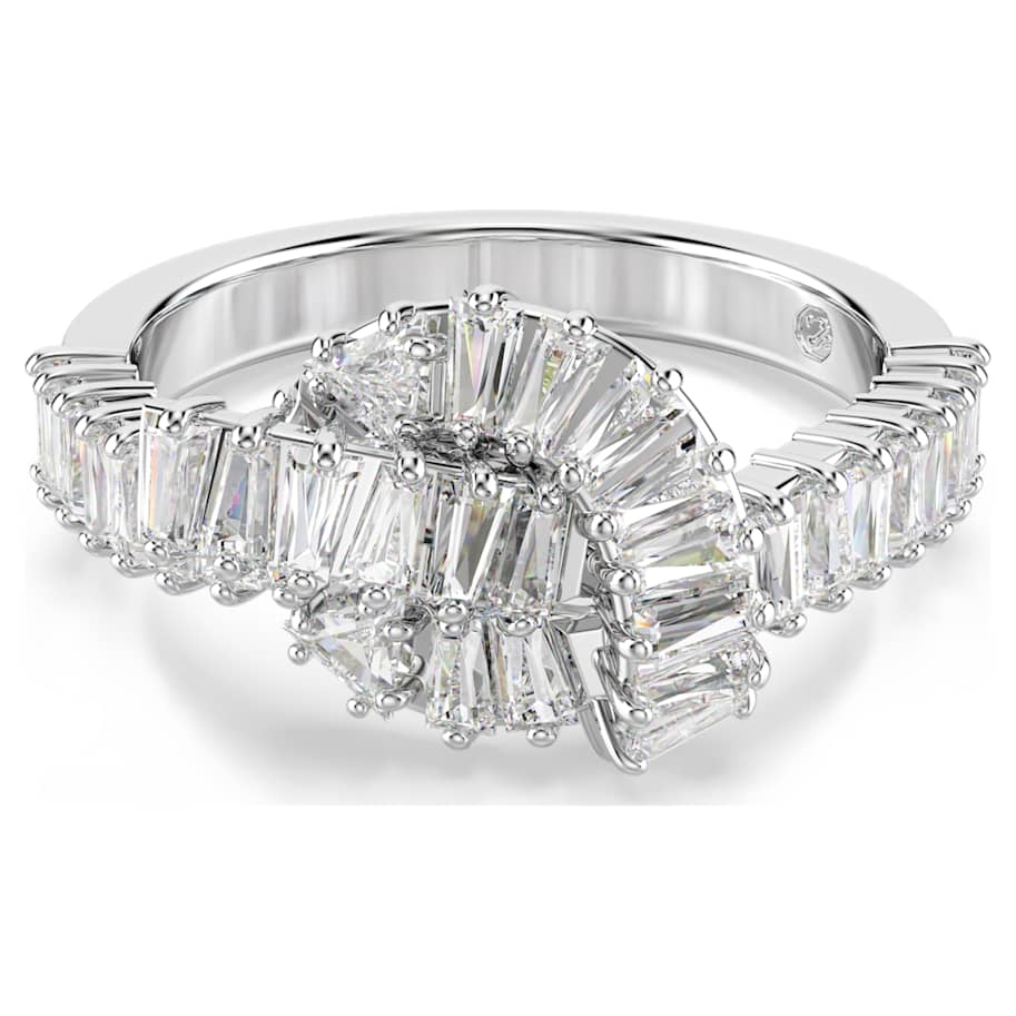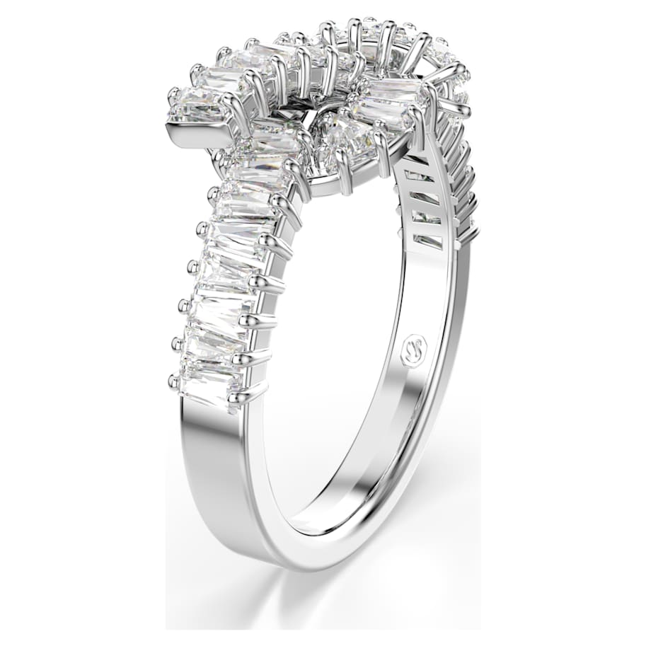 Give your style a light-catching twist with this elegant Matrix ring. Crafted with a ribbon-like knot, the rhodium plated design features a sophisticated adornment of baguette-cut Swarovski Zirconia, each placed in a prong setting. Modern and artistic, this ring pairs perfectly with other pieces of jewelry from the same family.