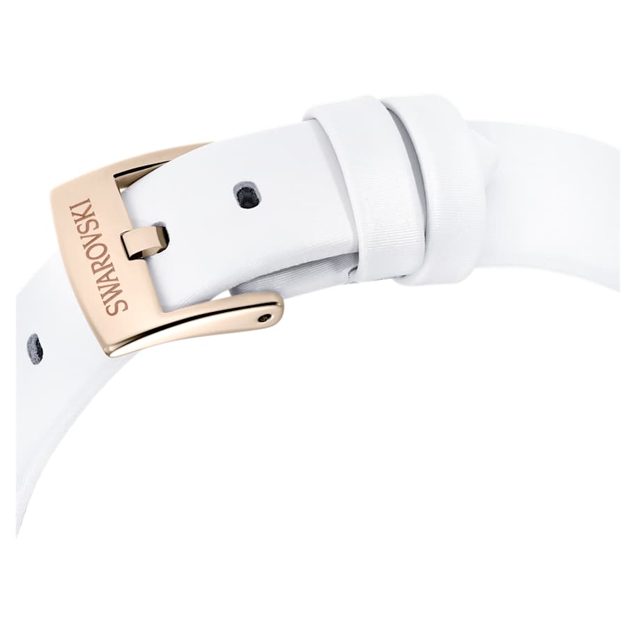 Echoing the iconic form of Swarovski’s Matrix Tennis jewelry, this watch makes its own elegant impression with crystals. The 30-mm stainless steel design has a champagne gold-tone finish and features a pavé of 30 clear crystals on the bezel. The sunray dial is further accented with crystals for the hour markers and includes a swan logo at 12 o’clock. Around the wrist, comfort is provided by the white leather strap, which includes satin finishing and a quick-release system. This Swiss made watch is water resistant to 50 meters and is completed with a single crystal placed in the crown. Wear it alongside jewelry from the Matrix Tennis family for a seamless overall look.