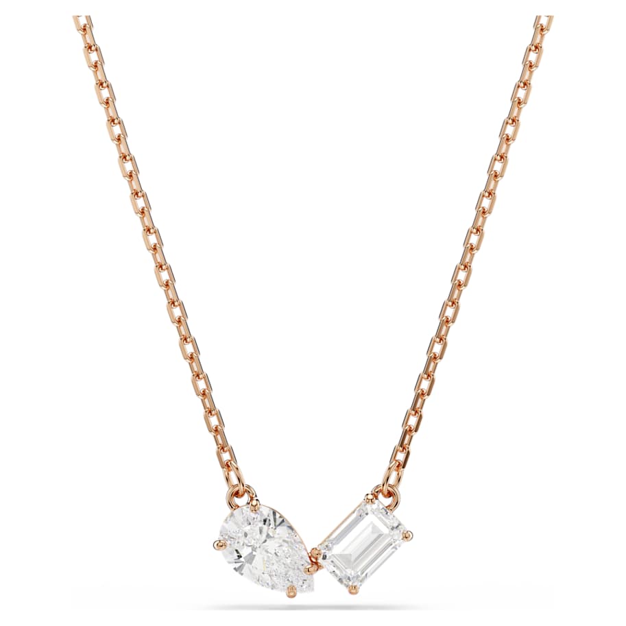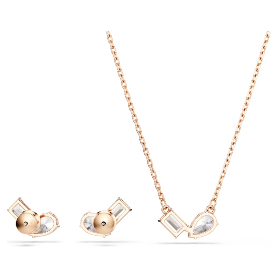 Create a look of overall elegance with this matching Mesmera pendant and earrings set. The eye-catching pieces are rose gold-tone plated and each feature a pair of prong-set Swarovski Zirconia in pear and octagon-step cuts. Simple yet refined, this set makes a perfect gift for any special occasion.